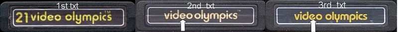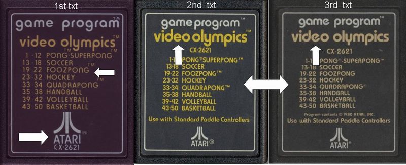 We start with the three text versions. In the photo above, the cartridge on the left is the original release. If for some reason your end label has fallen off, there are 2 things to look for to know if it's an original, 1st text, gate-fold game. The letters are larger listing the game options, which you can compare to the other two carts. The easy way is to see the very large Atari logo at the bottom of the label with the part number printed below it. With the 2nd text version, middle of the photo, you see that the game options print has gotten smaller. If you look at the arrow pointing up at the word “video”, it points at the “e”. The “e” is straight in the 2nd text version. The 3rd text version has the same size game options, but the arrow now points to an “e” that is slanted. This also goes for the word “game” at the top. All cartridges have the “game” program written, so that is where you would look for 2nd or 3rd text versions. The photo below shows the end labels of the same three cartridges from above. The one on the left is the 1st text version. Notice the number 21 before the game. All the original gate-fold games had numbers before their names. The 2nd text version again shows the straight “e” and the 3rd text shows the slanted “e”.