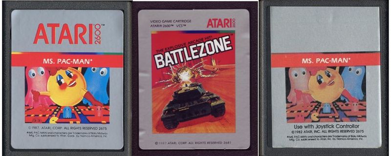 Above we see the Atari grey labels. They are the exact version of the silver variations but have a dull grey color. The one on the left featuring Ms. Pac-Man is categorized as PicGr1 meaning grey 1. It has the small photo with the large Atari logo centered above it. The one in the middle, Battlezone, is PicGr2 being the grey 2 version. It has the larger photo with the small Atari logo moved to the upper right. On the right we see something strange. This Ms. Pac-Man but does not have an Atari logo. I have scans for 2 variations of this type of label. I don't know where it's from, or that it's possibly a pirate. I'm showing it here for info purposes and maybe a reputable collector can confirm this is legitimate. I called this PicGr0 meaning grey 0 because it has nothing. Though I have this in the variation listing, I'm hesitant on calling it real. If you look at the label, it's longer than the indentation and is square whereas normal Atari labels have rounded corners. In most cases, cartridges that have the 1st grey also have a 1st silver version. Those that have the 2nd grey usually have the 2nd silver version.