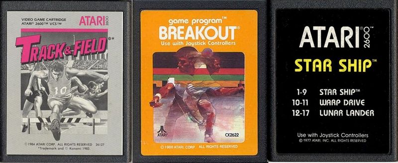 Atari made a few strange labels that are not categorized under any of the listings we've talked about so far. The one on the left is Track & Field. This is the only label version known. The closest it would come is to a grey 2. The middle cartridge is a late release of Breakout with an orange label. Another unique item, though Breakout has many variations. Star Ship is our 3rd photo on the right above. This has been dubbed an “odd” label, again like no other released.