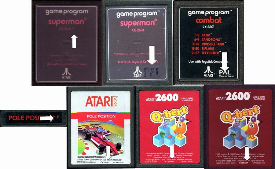 We move on to the PAL labels. These are in the PAL format, which cannot run on a normal tv. The screen will flip vertically, thus you know you have a PAL cartridge. In most cases, you know you have a PAL cartridge because it is on the cartridge label somewhere. Above we show the many examples of PAL cartridges. The first is the text label where the product number has a “- P” added to it. The arrow points at this in the first Superman example. The second Superman shows a “PAL” stamped on the label, also pointed out by the arrow. The third cartridge is Combat, where Atari actually printed PAL on the label as shown with the pointing arrow. On the second line, I began by showing only an end label, in this case it came off a silver version of Pole Position. The main label does not have any notification the cartridge is PAL, but rather the “p” on the end label denotes it. Problems arise if these end labels fall off. The “p” on the end label is found in the black, silver and sometimes grey picture labels. Next to the Pole Position end label, we actually have a grey version of Pole Position where the “p” comes after the product number on the main label. This is a rarity. On the red and brown labels, the “p” is printed after the product number. This is the standard for PAL cartridges with these labels. Boxes Below are the boxes in what we consider their timeline release order. This describes the same game title with different box printings. If anyone has other information that can help, please contact us. We are guessing the order based on the revision numbers that were printed on the tiny flaps, or sometimes lack of revision numbers. You can find the revision numbers either at the top or bottom of the tiny flaps, in the form of Rev 1, Rev 2, etc. We are also using the date that is printed on the tiny flaps by the printer as a second and more important guideline. Sometimes the same identical box with Rev number is printed by more than one printer over a span of several years. Under each individual listing for boxes, we have added or will be adding the printer with their printing date and will eventually be revising the order of the boxes shown in what we perceive to be the correct chronological order of release. I'm listing them here and will give better explanations under each photo section. The most popular known printers are Bertco Graphics, Adpak San Francisco, Ivy Hill, Shorewood Packaging, and SUS. There are some other items sometimes written on the tiny flaps that may identify or belong to a company, but we've yet to identify them. 1.) Gatefold box 10.) Generic no-frills box