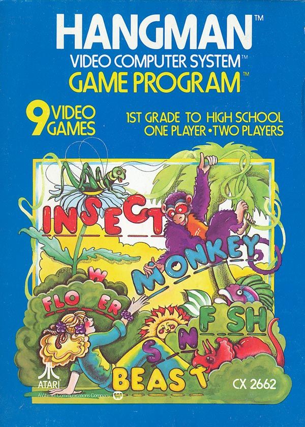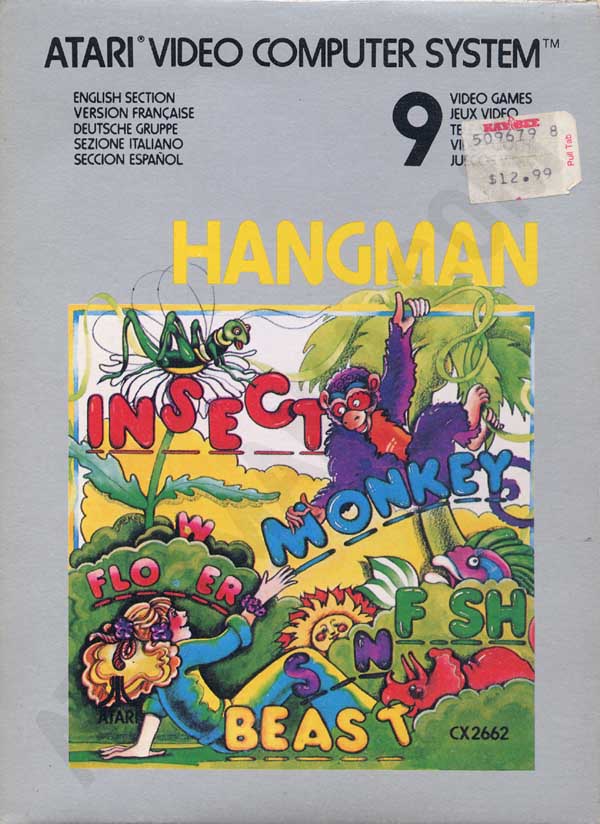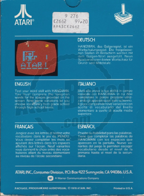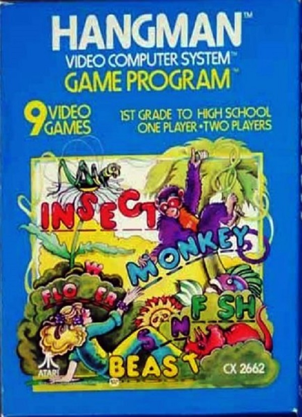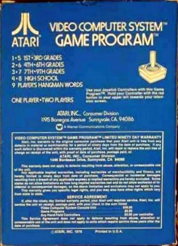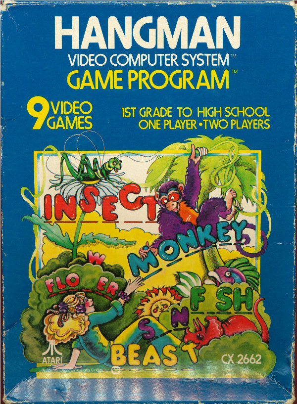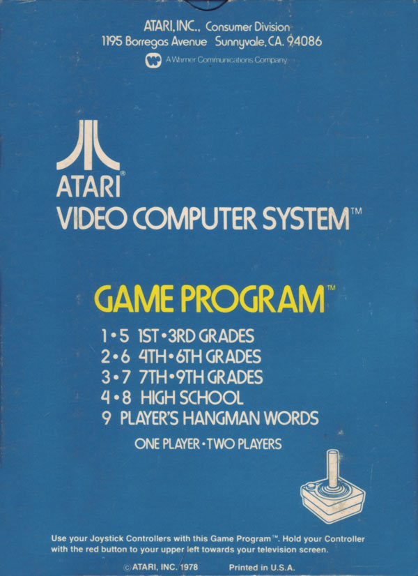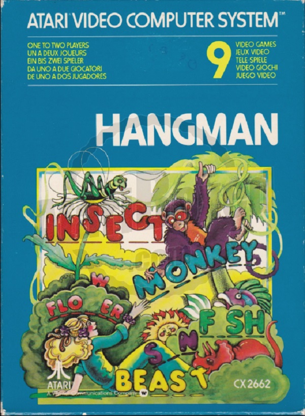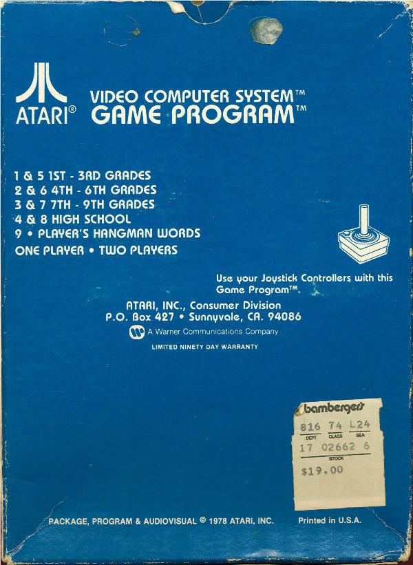 Hangman Boxes 1) ©1978, blue box, “Game Program” in large yellow letters in center, game options below that, no warranty info on back, Printed in USA, ™ next to title on front, standard flap style box, 2 versions of tiny flap, one has a C0 number with the other flap blank, the other has “Bertco Graphics” on tiny flap Front