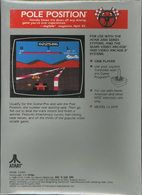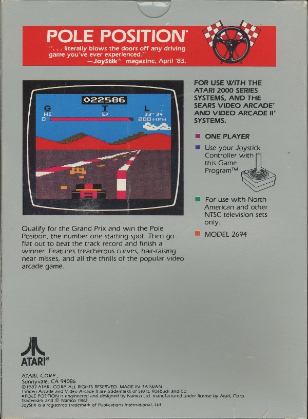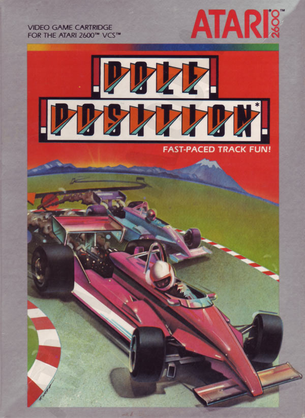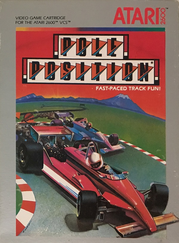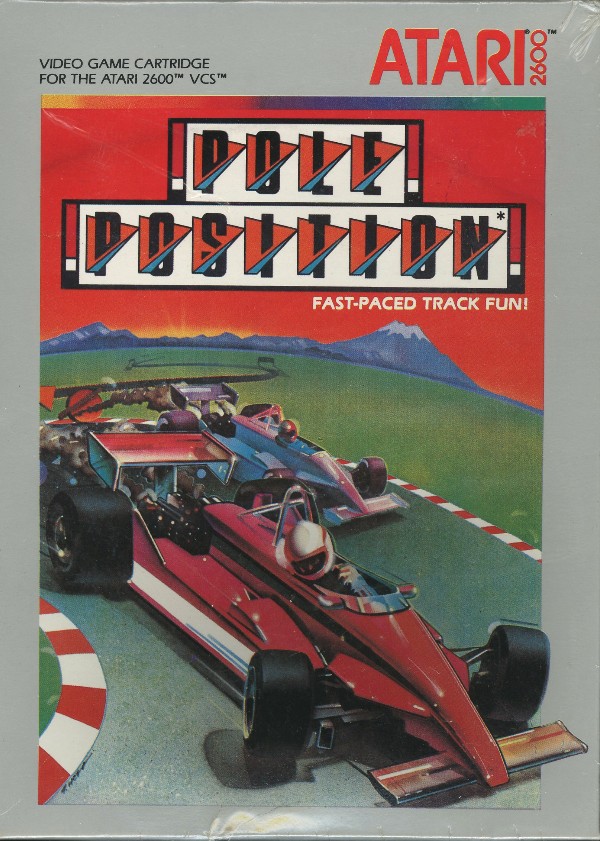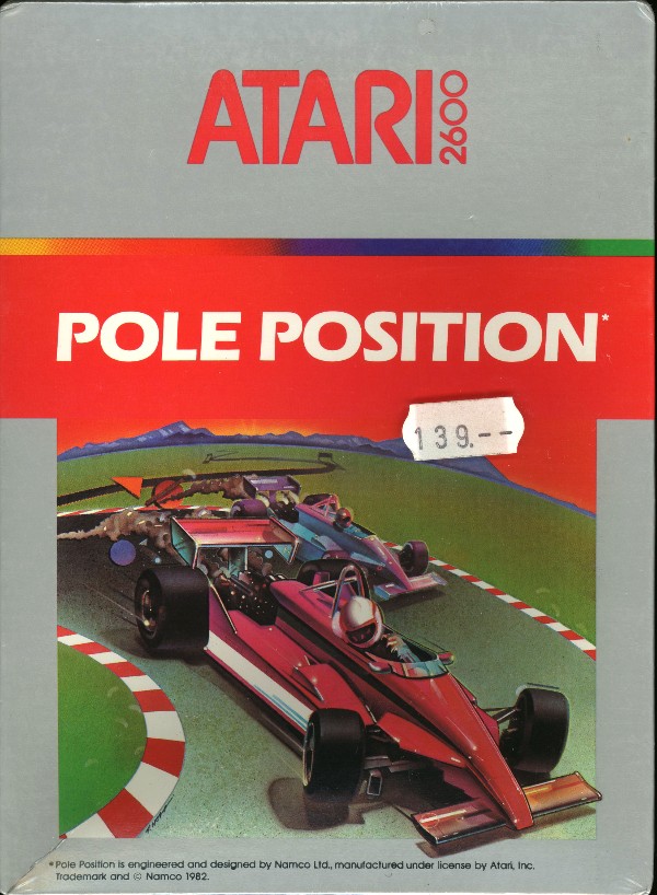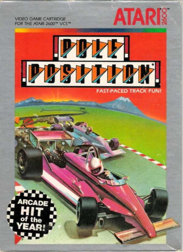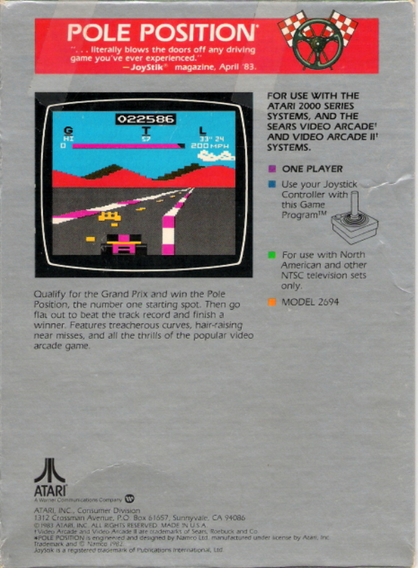 Pole Position Boxes 1) ©1983, silver box, Made in USA, Rev A on flap, tab flap style box, “Shorewood Packaging” 7/83 on tiny flap Front