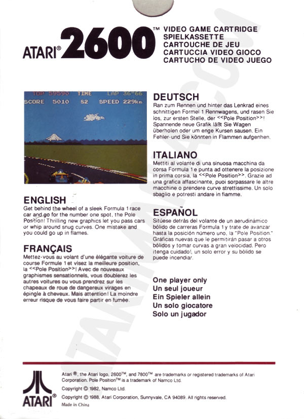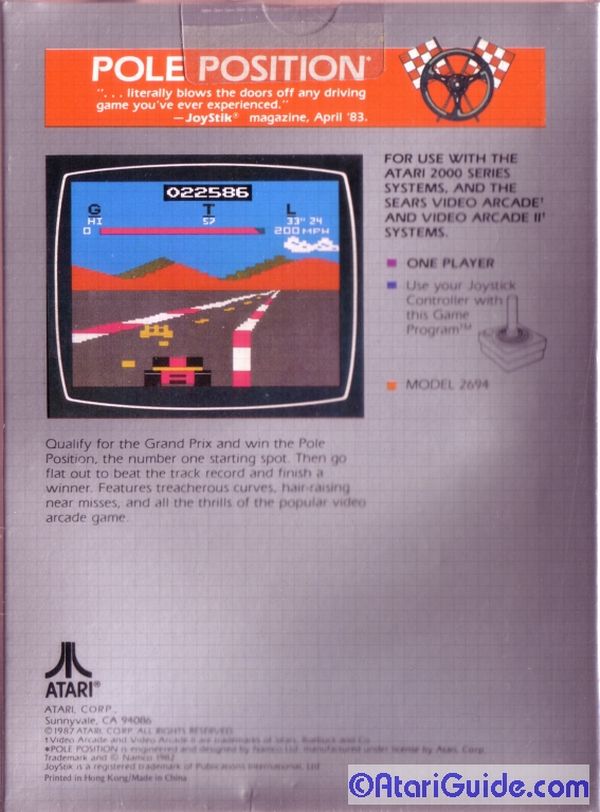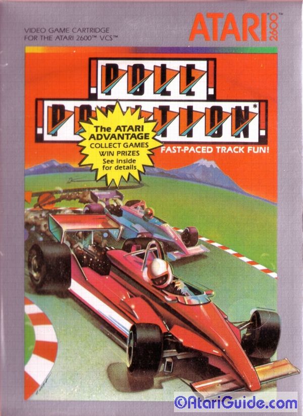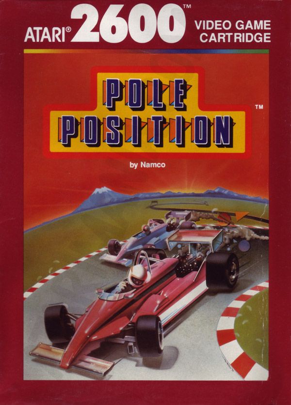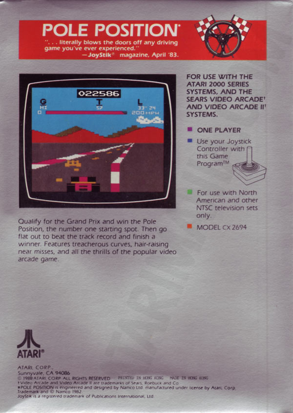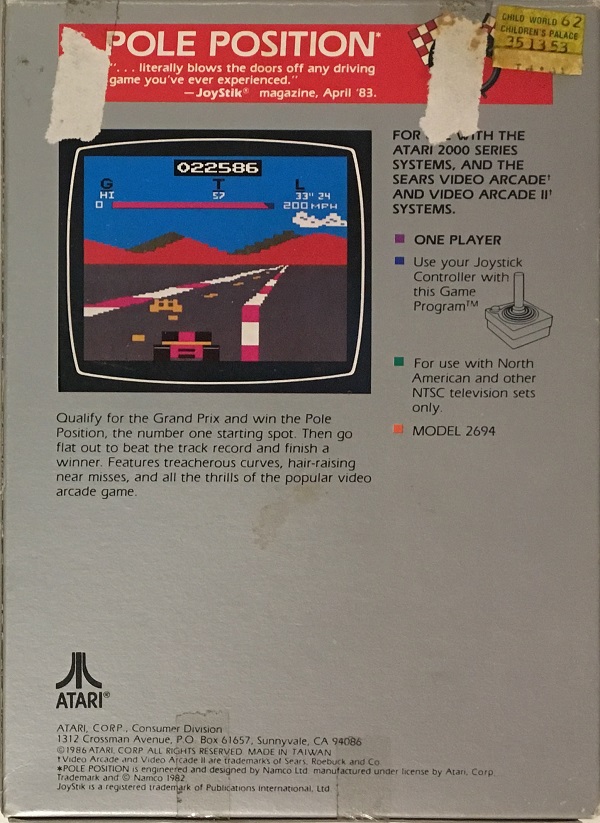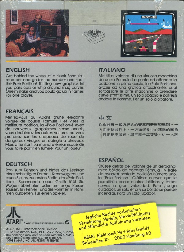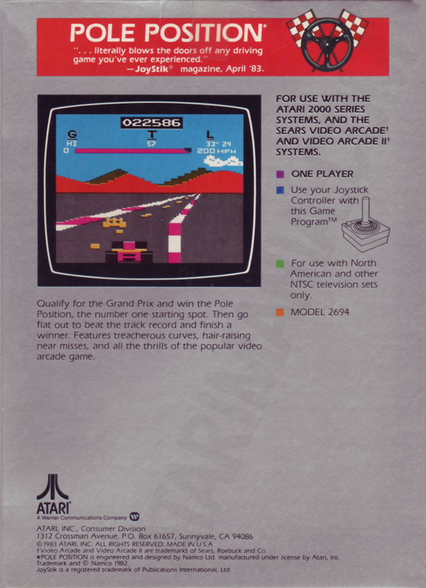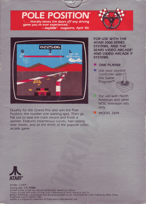 Pole Position Boxes 1) ©1983, silver box, Made in USA, Rev A on flap, tab flap style box, “Shorewood Packaging” 7/83 on tiny flap Front