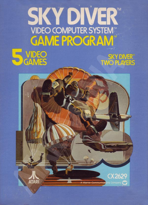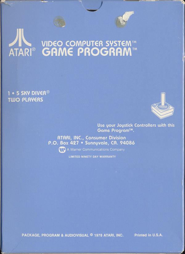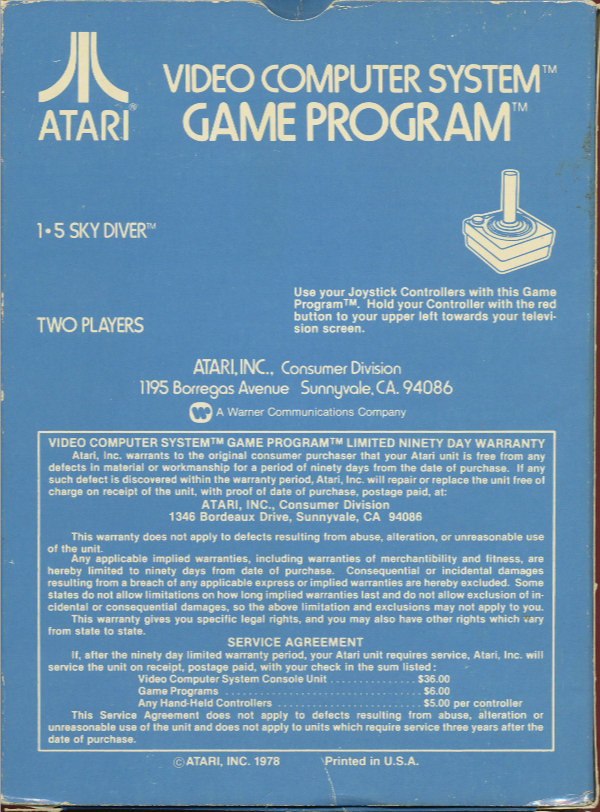 Sky Diver Boxes 1) ©1978, sky blue box, blue background warranty box, © outside warranty box, Printed in USA, Rev 4 on flap, photo on front of box is glossy, “Bertco Graphics” 11/78, 6/79 on tiny flap, tiny flaps are blue and white Front
