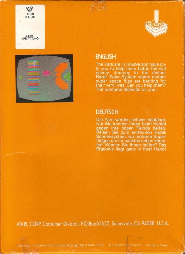 3) ©1985, orange box, 2 languages, Printed in Taiwan Front