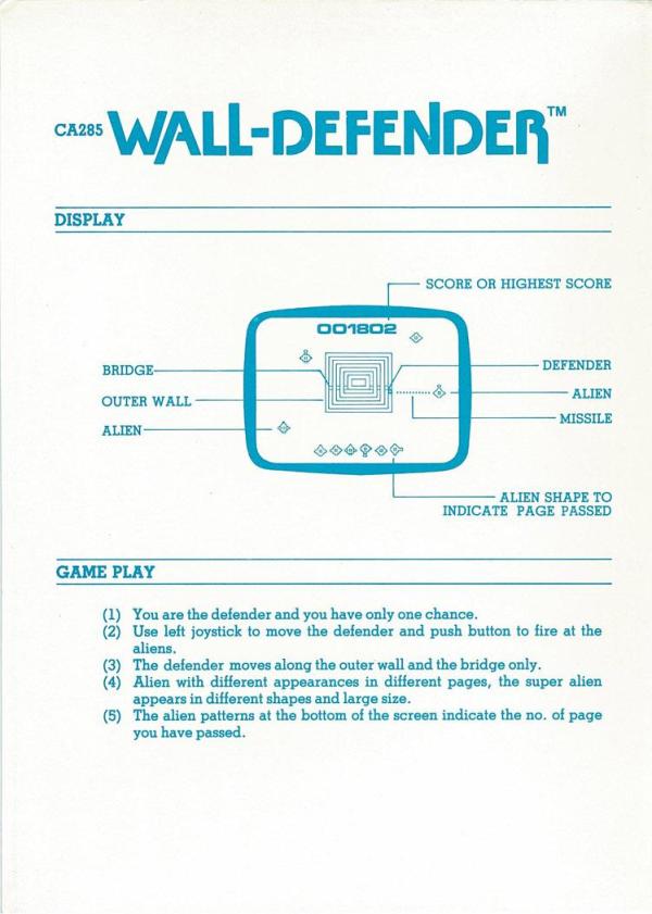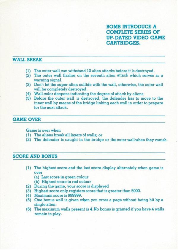 Wall Defender Manual A) ©1983, white, no product #, 4 pages, size?”, Printed in Hong Kong