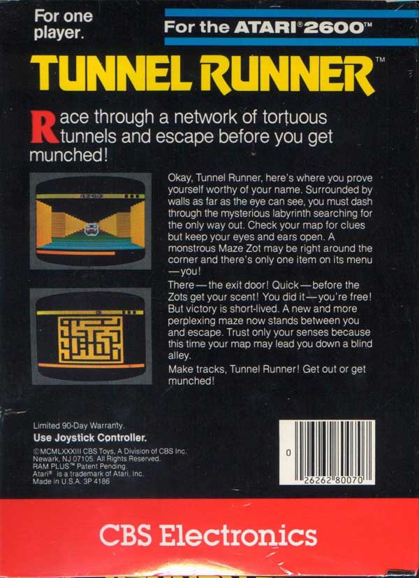 1) ©1983, black box with red stripe “CBS Electronics” on red stripe, “For the Atari 2600™” on top between two blue stripes, “RAM Plus”, Made in USA