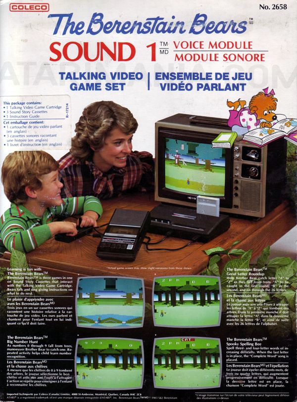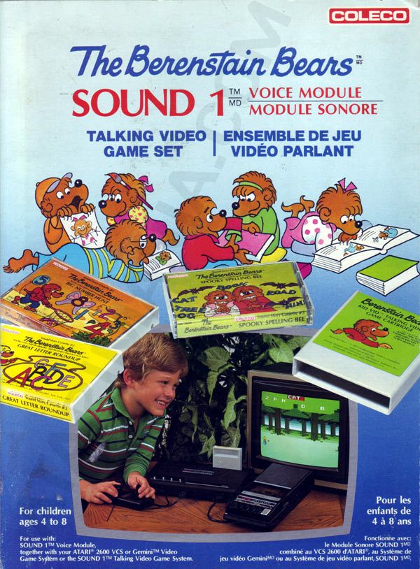 2) ©1983, blue book style opening box, inside has four slots for cart and three cassettes, photo of child playing game along with illustration of the Berenstain Bears on front, back has child playing with mother watching along with some screenshots, English/French box, Imported by Coleco (Canada), refers to use Sound 1 Voice Module instead of Kid Vid Front