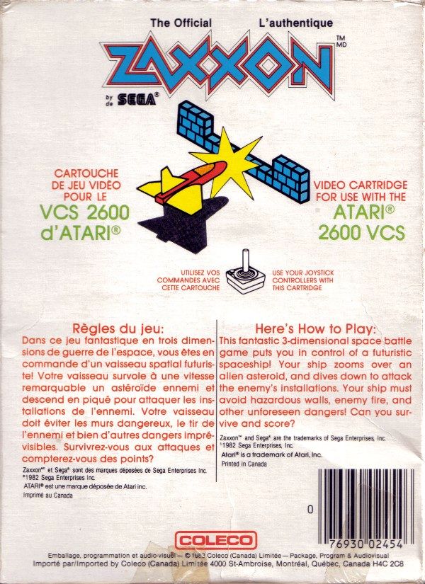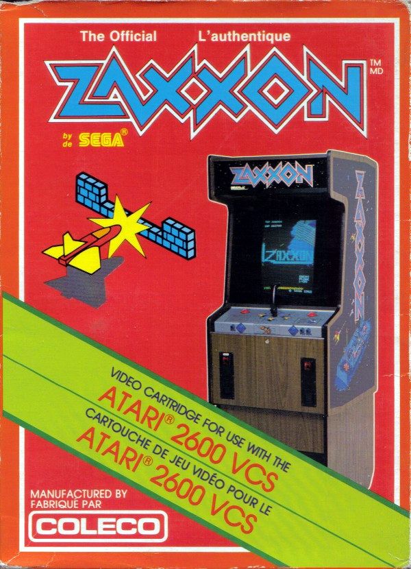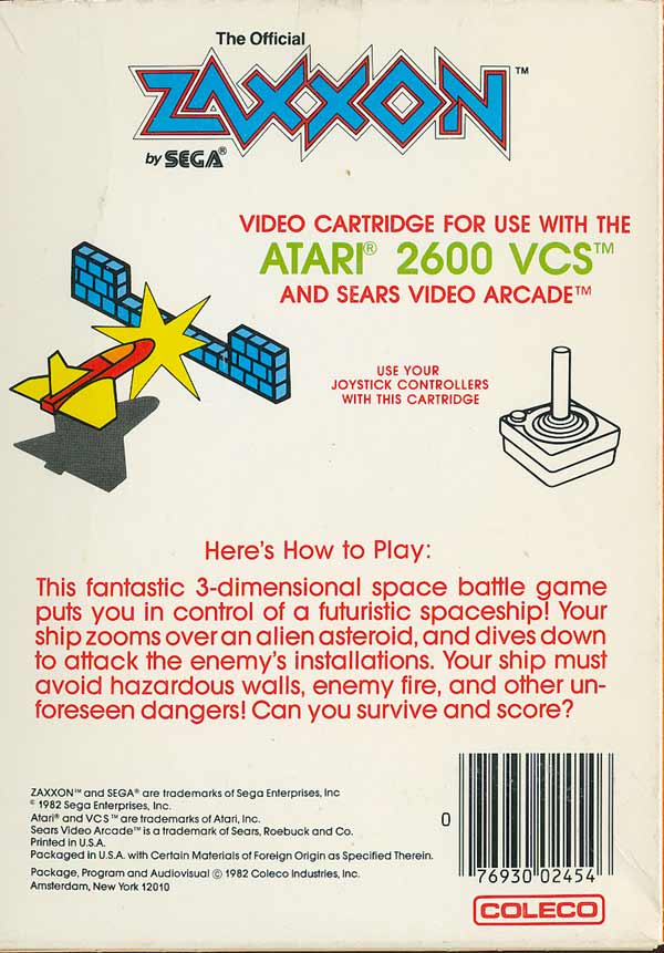 Zaxxon Boxes 1) ©1982, orange-red box, photo of arcade machine, illustrated space ship next to machine, illustrated space ship on back, Printed in USA, “Ivy Hill” 2/83, 5/83 on tiny flap Front