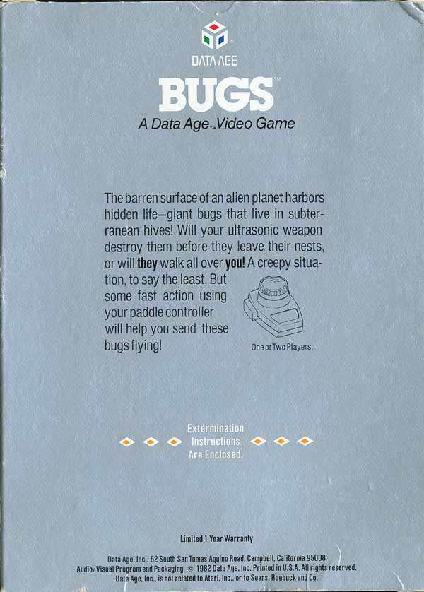 Bugs Boxes 1) ©1982, silver box, illustration same as label, white letters on sides and flaps, Printed in USA, “MP14005A” on flap 2) ©1982, silver box, illustration same as label, black letters on sides and flaps, Printed in USA, “114-005B” on flapNOTE: Both front and back of the boxes are exactly the same. Difference is on the side as shown below Front