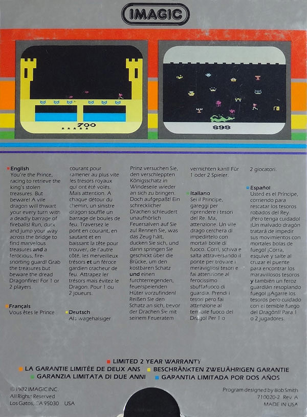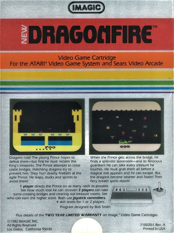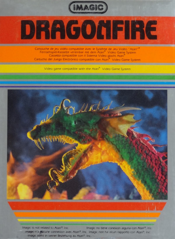 Dragonfire Boxes 1) ©1982, silver box, illustration same as label, no rev. number, Printed in USA, plastic tray inside, “New” written to the left of the title Front
