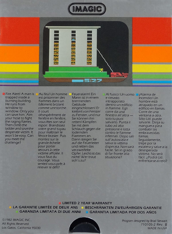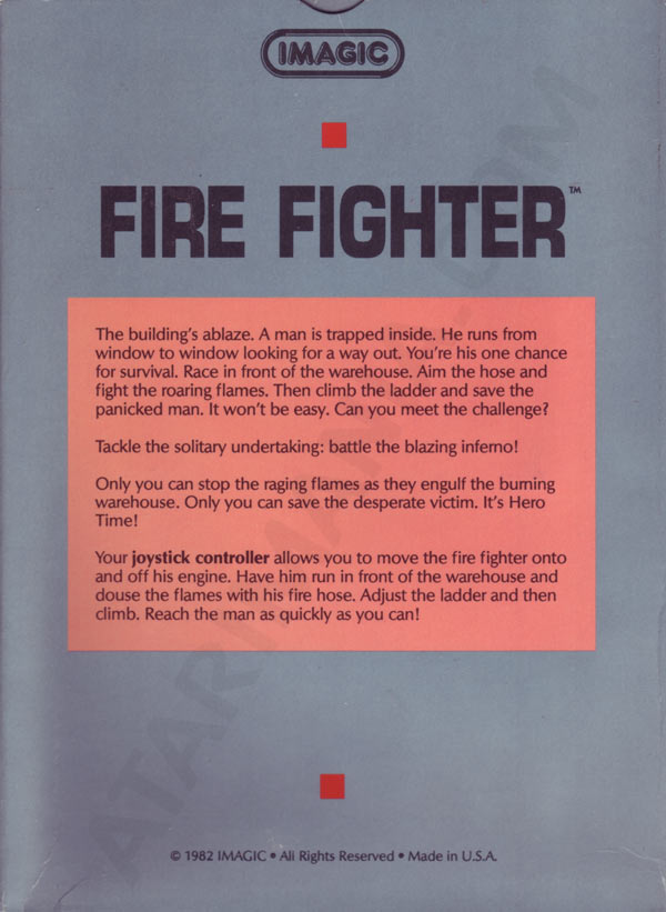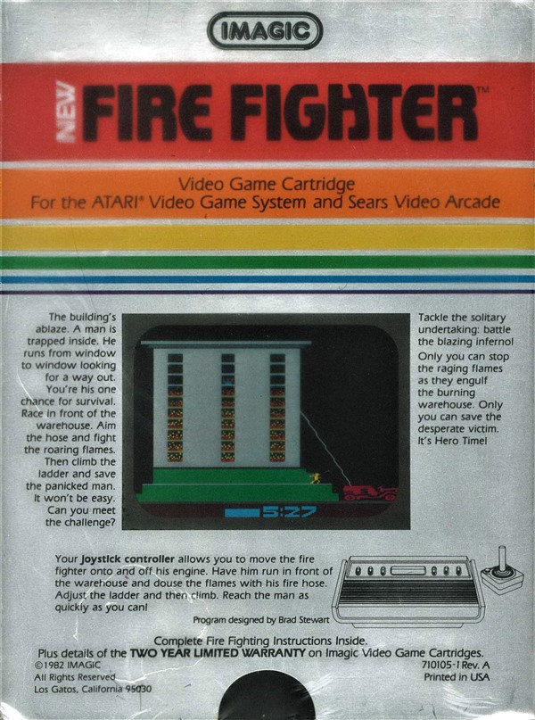 Fire Fighter Boxes 1) ©1982, silver box, illustration same as label, 710105-1 Rev A, Printed in USA, “New” written to the left of the title Front