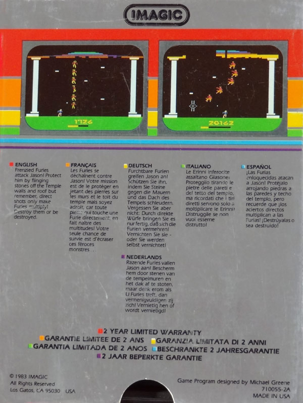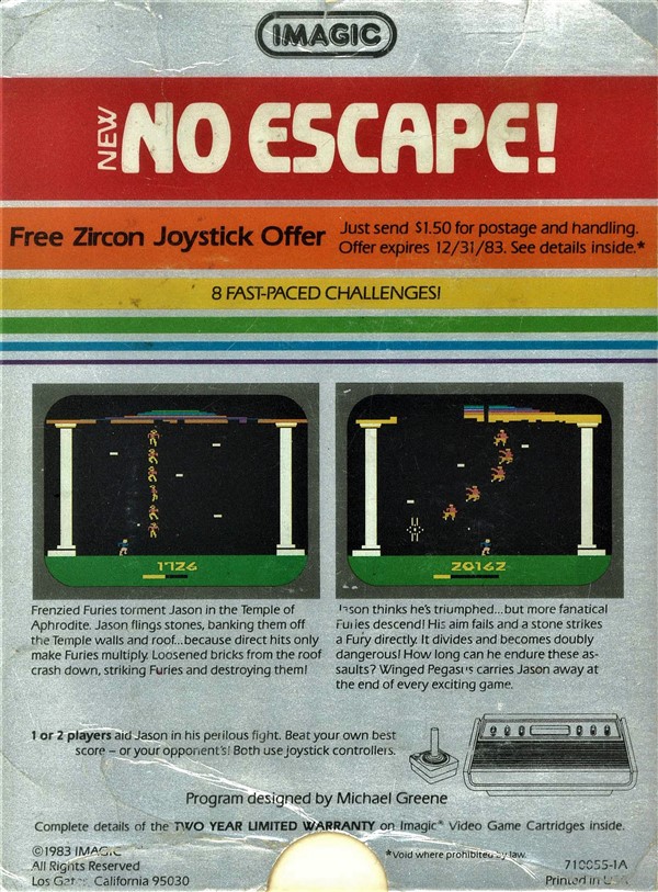 | No Escape Boxes 1) ©1983, silver box, yellow sticker “free joystick $15.94…”, side of box has orange background behind the title, 710055-1A, Printed in USA, “New” written to the left of the title, back of box, “free Zircon Joystick offer, Just send $1.50 for postage and handling. Offer expires 12/31/83. See details inside” Front