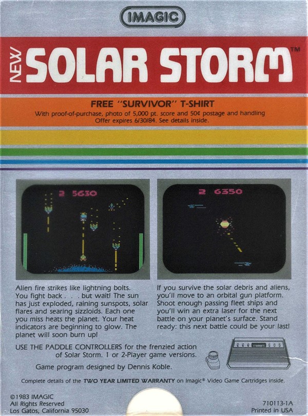 1) ©1983, silver box, picture of pilot inside cockpit, 710113-1A, Printed in USA, “New” written to the left of the title bar, blue sticker “Survivor T-shirt free with a hot score details on back