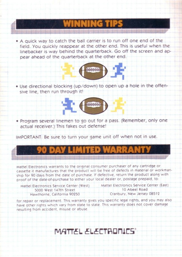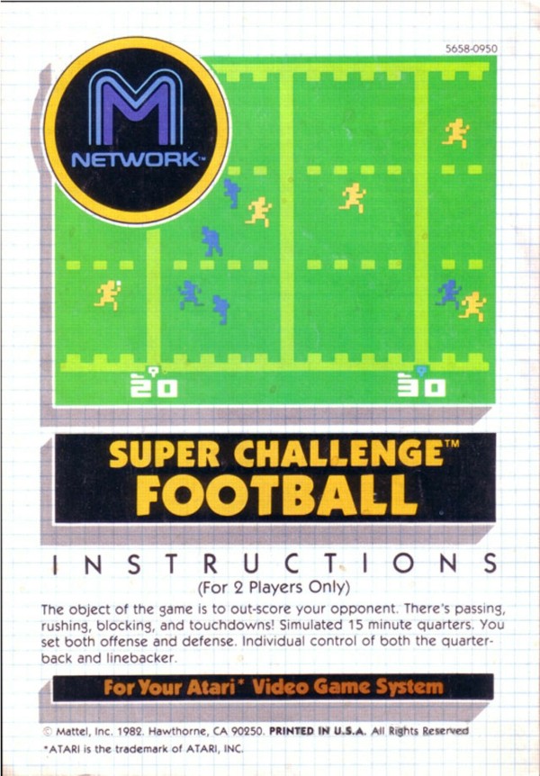 Super Challenge Football Manual A ©1982, white/blue grid, 5658-0950 on front, 6 pages (folds out), 4.75 x 6.75”, Printed in USA