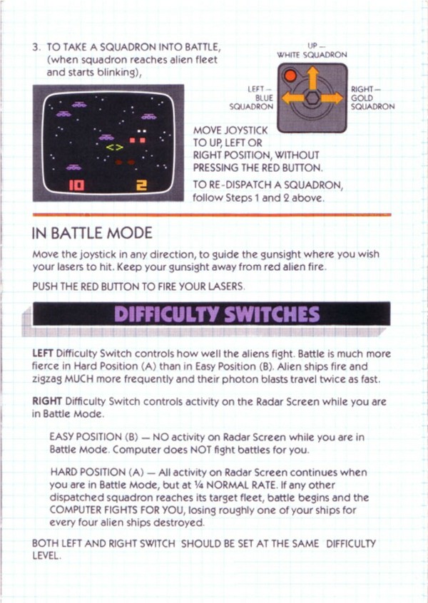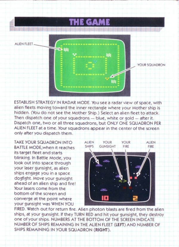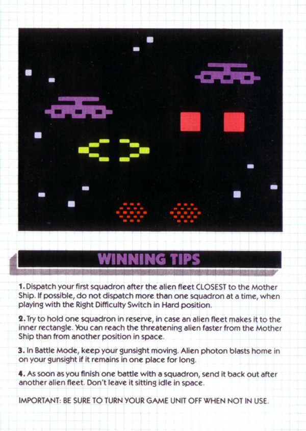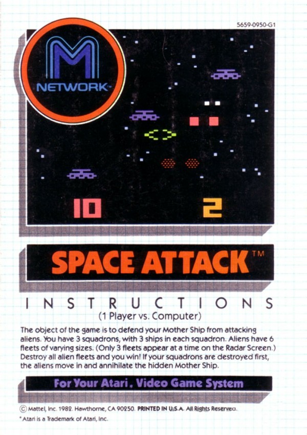 Space Attack Manual B ©1982, white/blue grid, 5659-0950-G1 on front, 6 pages (folds out), 4.75 x 6.75”, Printed in USA