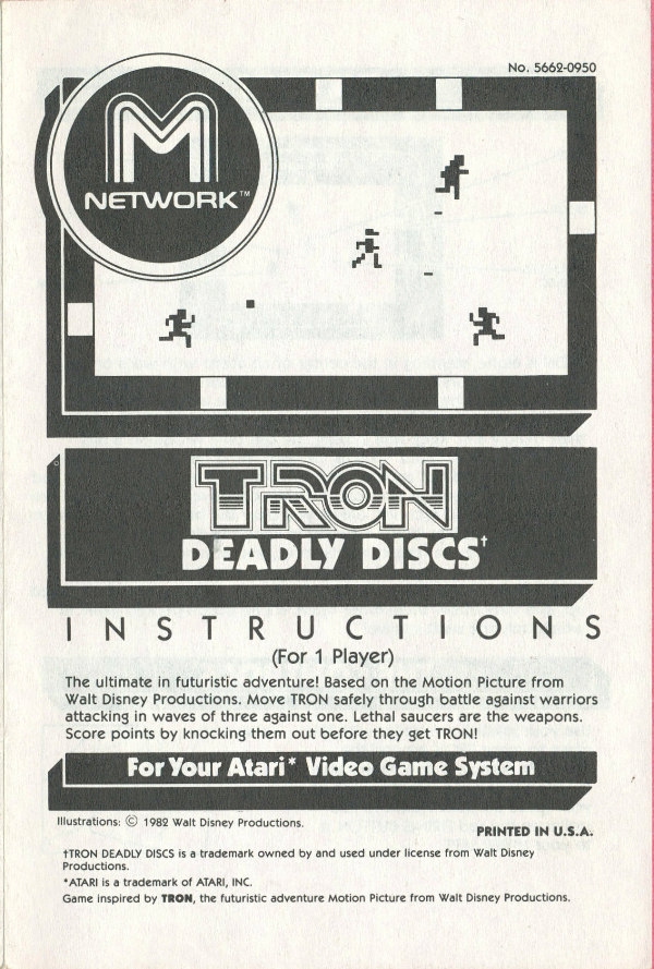 Tron Deadly Discs Manual B no ©, white, No. 5662-0950 on front, 6 pages (folds out), 4.25 x 6.25”, Printed in USA, b&w cover and contents