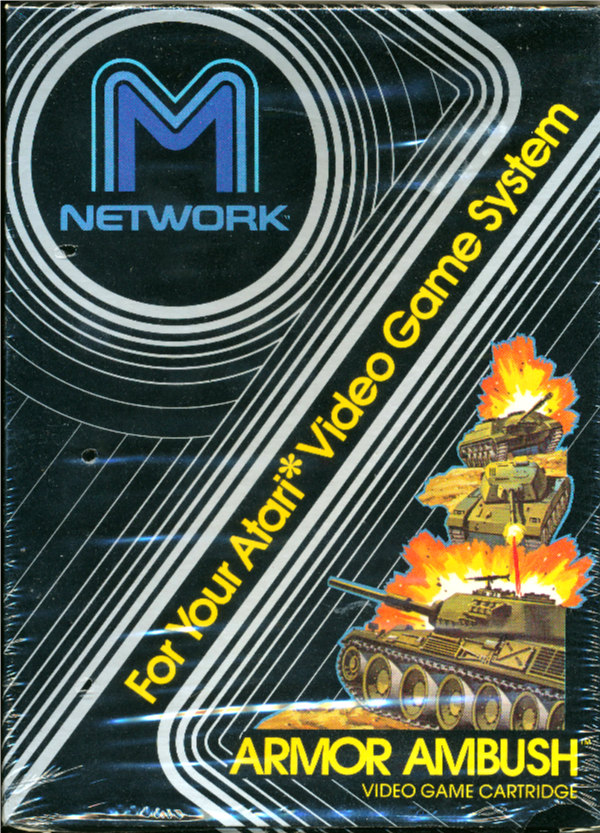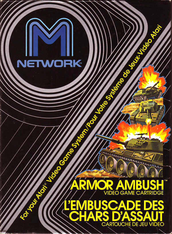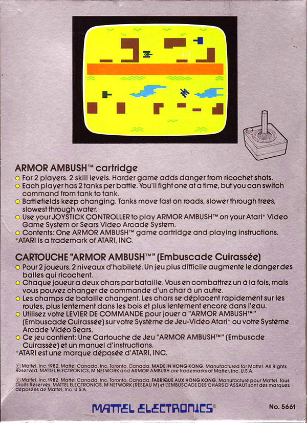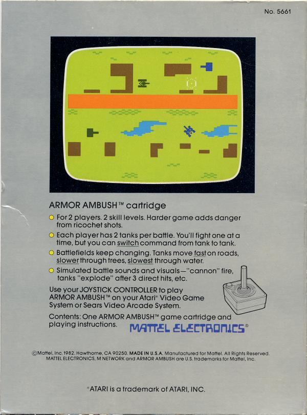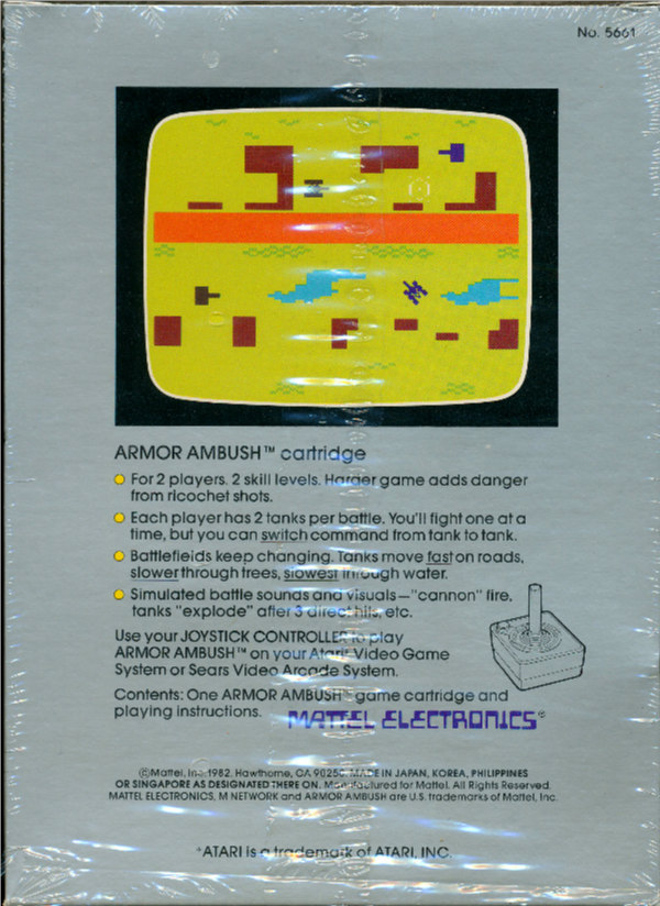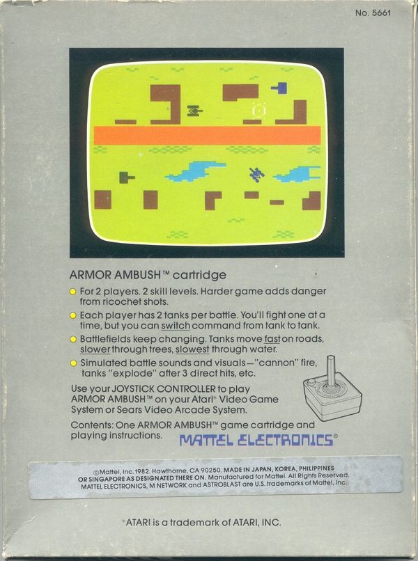 Armor Ambush Boxes 1) ©1982, black box, Made in USA, background color is grey with stripes and back of box Front
