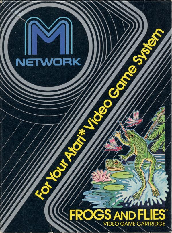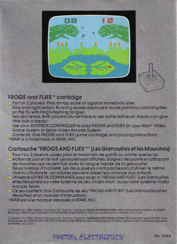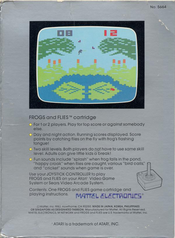 Frogs and Flies Boxes 1) ©1982, black box, “Made in Japan, Korea, Philippines or Singapore as designated thereon.”, background color is grey with stripes and back of box Front