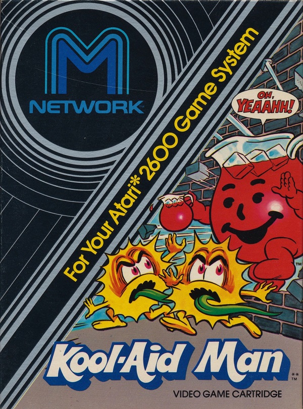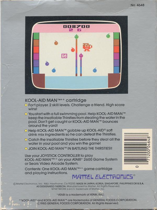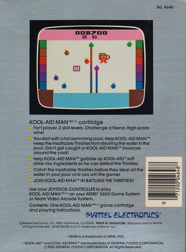 Kool-Aid Man Boxes 1) ©1983, black box, Made in Singapore, background color is grey with stripes and back of box Front
