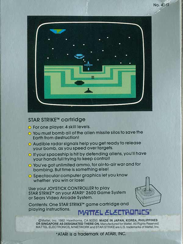 Star Strike Boxes 1) ©1982, Made in Singapore, Distributed by Intellivision Inc. Front