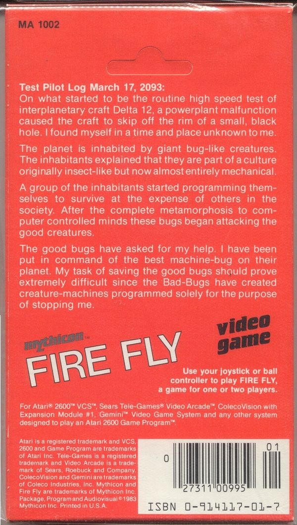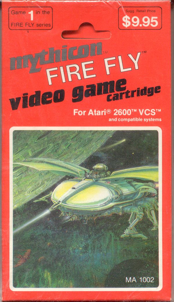 1) ©1983, orange box, illustration same as label, “game 1 in the Fire Fly series”, Sugg. Retail Price $9.95 in upper right corner, box is small in size