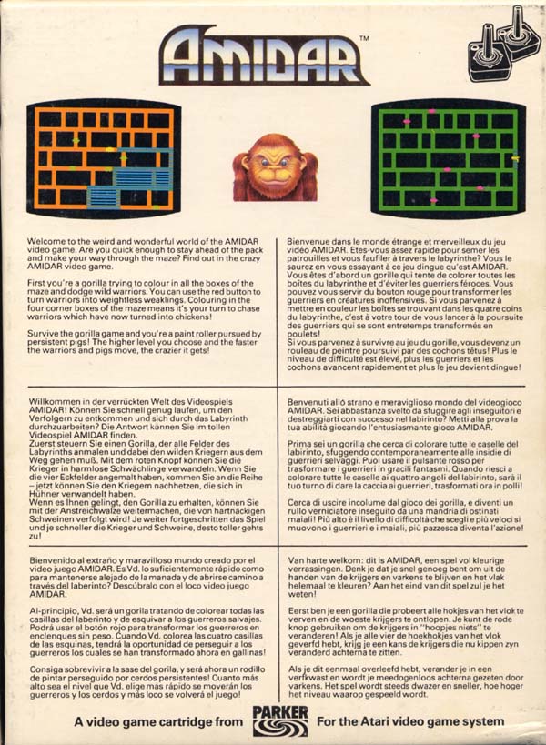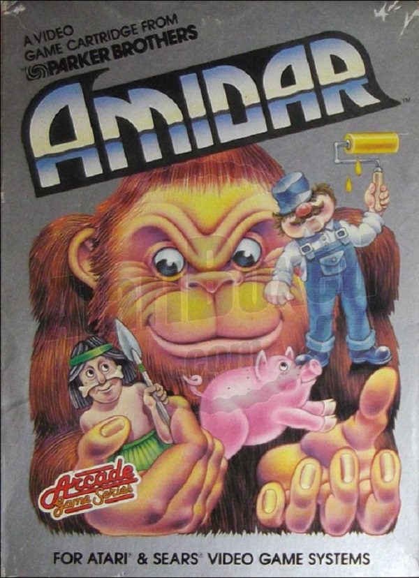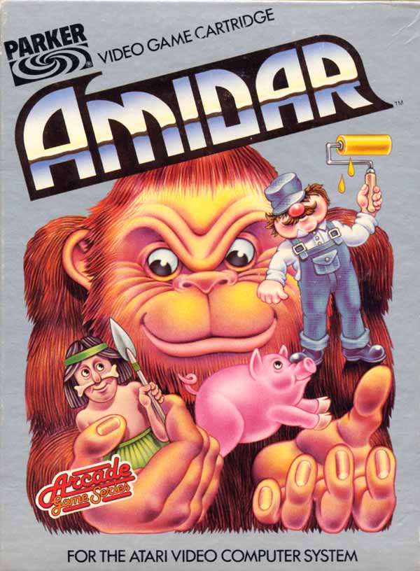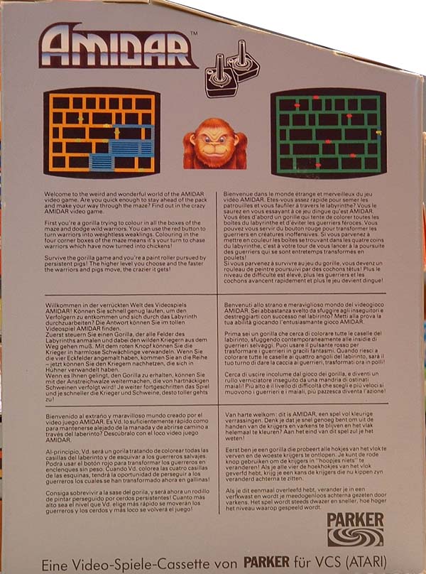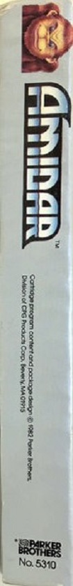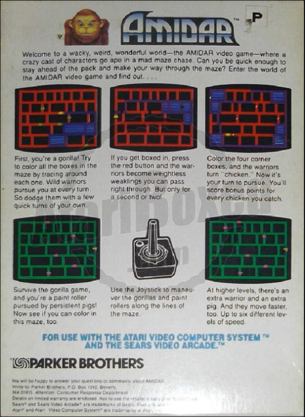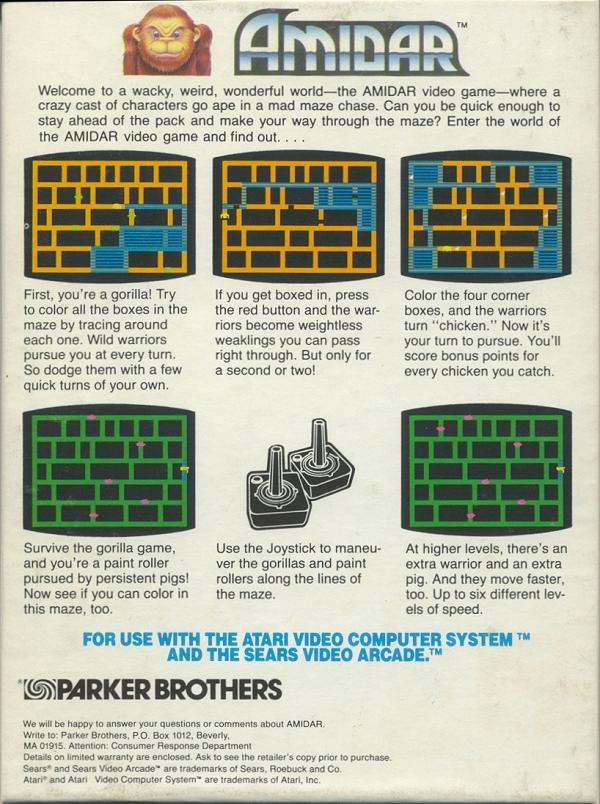 Amidar Boxes 1) ©1982 on side of box, silver box, two piece box, illustration same as label, Made in USA, “For Atari & Sears Video Game Systems” printed on bottom front, right side goes up, left side goes down Front