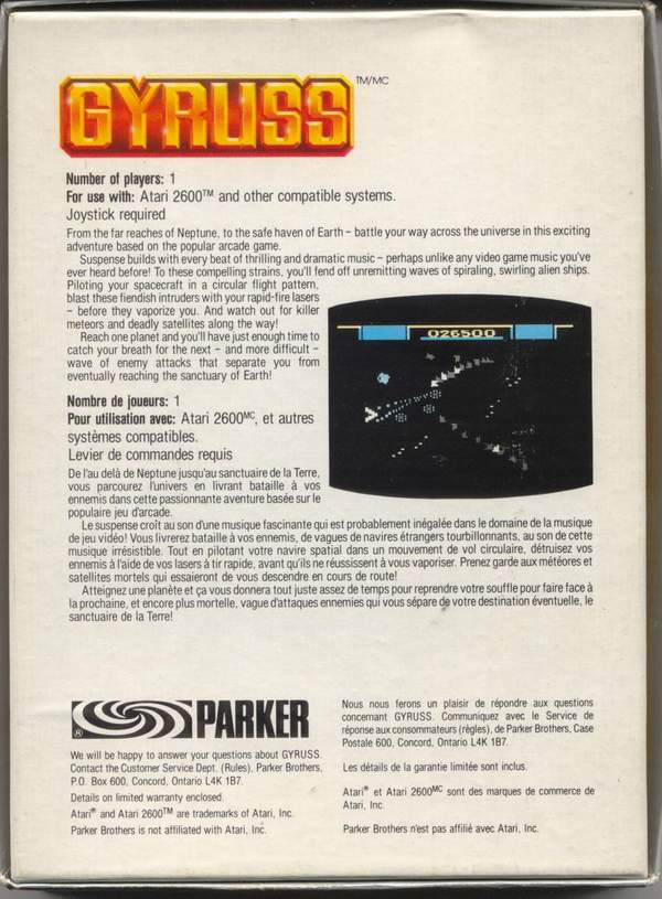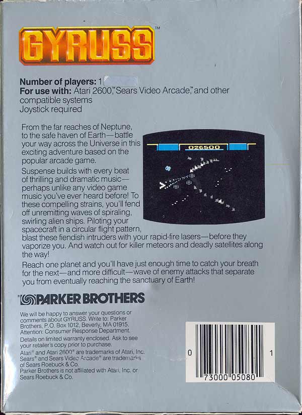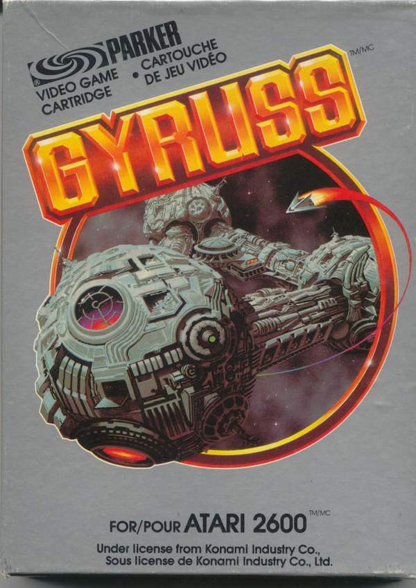 Gyruss Boxes 1) ©1984 on side of box, silver box, standard box with top flap, illustration of space station Front