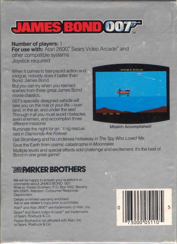 1) ©1983 on side of box, silver box, two piece box, illustration classic James Bond standing in swirl like beginning credits of the movies
