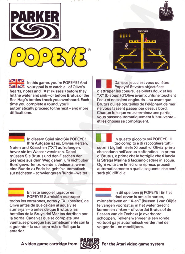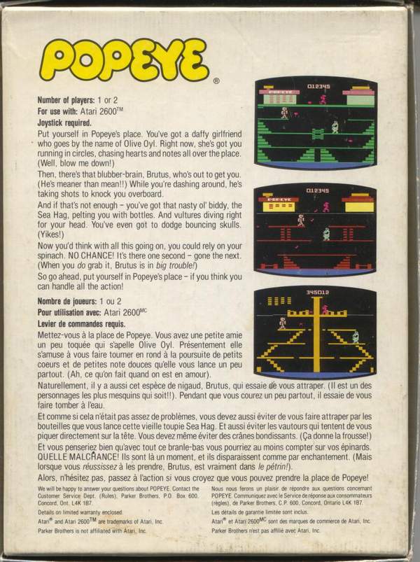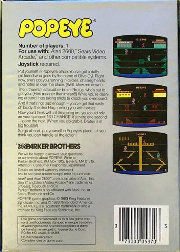 2) ©1983 on side of box, two piece box, illustration same as label, Popeye has a word balloon, “Win a Popeye arcade Game! Instant winner game card inside, No purchase required. Details on back.”, Made in USA, right side faces up, left side faces down Front