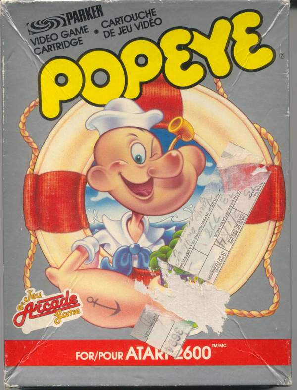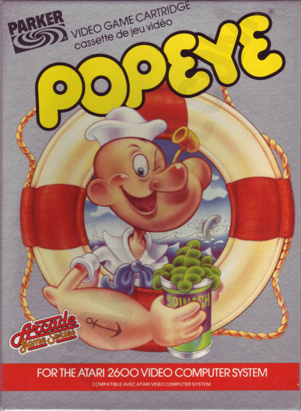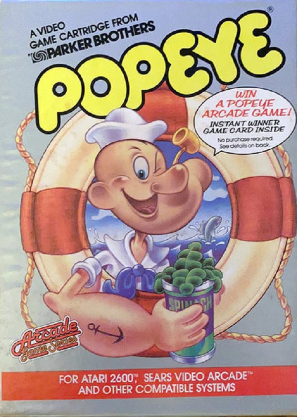 Popeye Boxes 1) ©1983 on side of box, silver box, standard box with top flap, illustration same as label, Popeye has a word balloon, “Win a Popeye arcade Game! Instant winner game card inside, No purchase required. Details on back.”, Made in USA, right side faces up, left side faces down Front