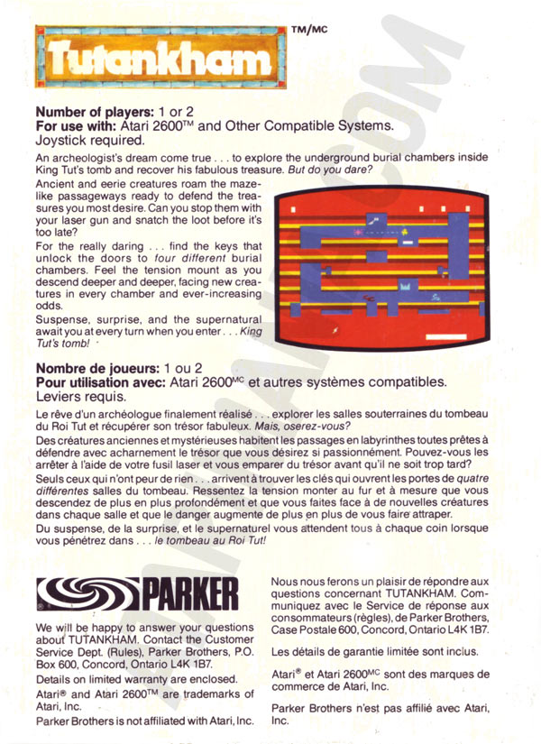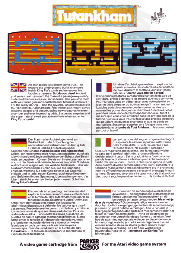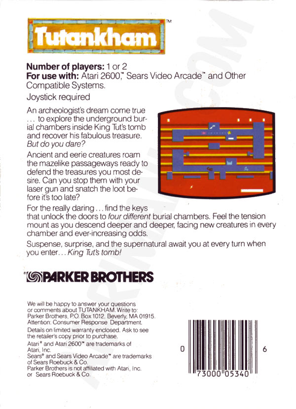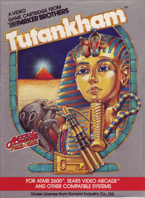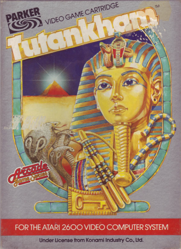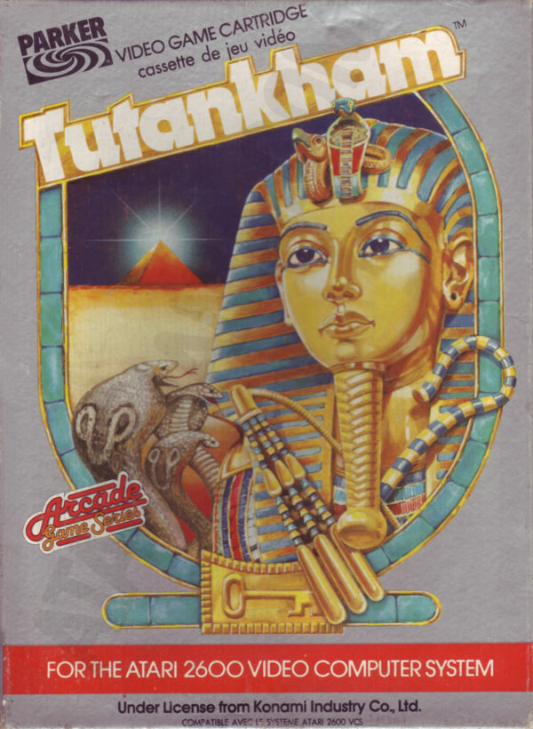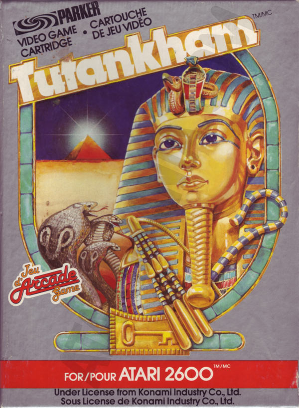 Tutankham Boxes 1) ©1983, silver box, standard box with top flap, illustration same as label, Made in? Front