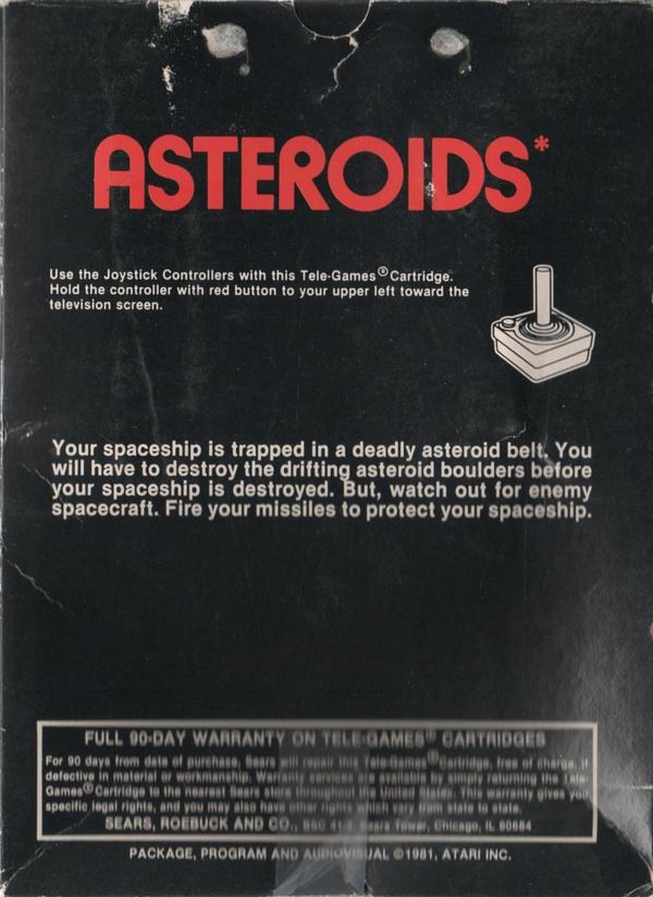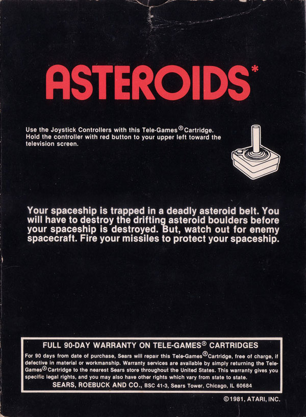 Asteroids Boxes 1) ©1981, black with red letters, illustration same as picture label, warranty info on back, 66 games, no Printed, #49-75163 on side, bottom back has “©1981, Atari, Inc.”, Rev 1 on flap, standard flap style box, “Adpak San Francisco” on tiny flap Front