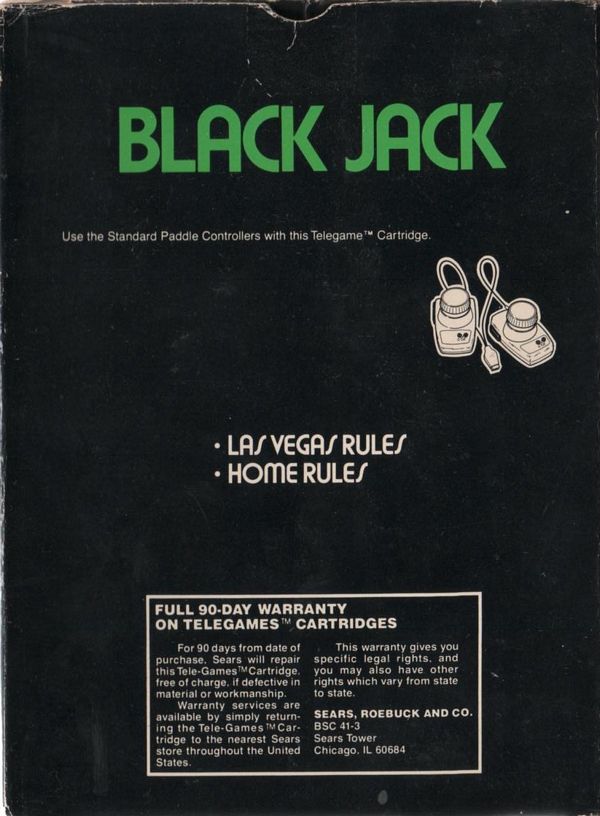 2) no ©, black box with green letters, Black Jack (two words), illustration same as picture label, warranty info on back, game options in middle, , #6-99805 on side, no printed, standard flap style box, no Rev on flap, “Adpak San Francisco” no date on tiny flap Front Back