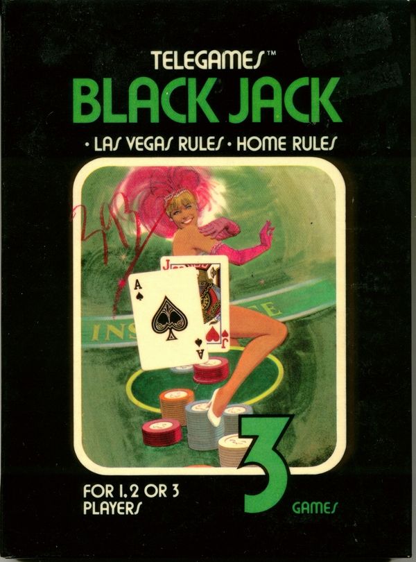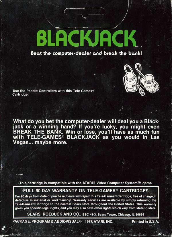3) ©1977, black box with green letters, Blackjack (one word), illustration same as picture label, warranty info on back, no game options shown, Printed in USA, glued flap style box, Rev 1 on flap Front Back