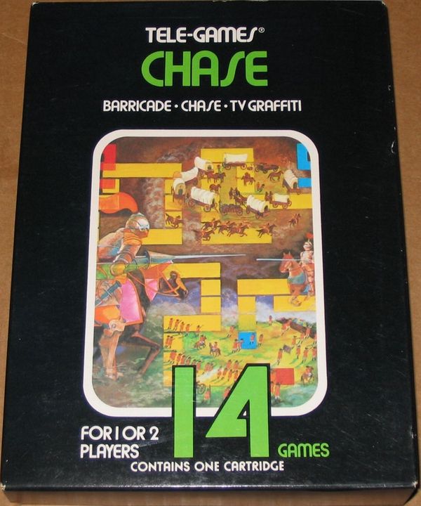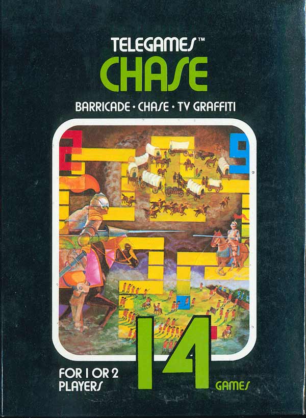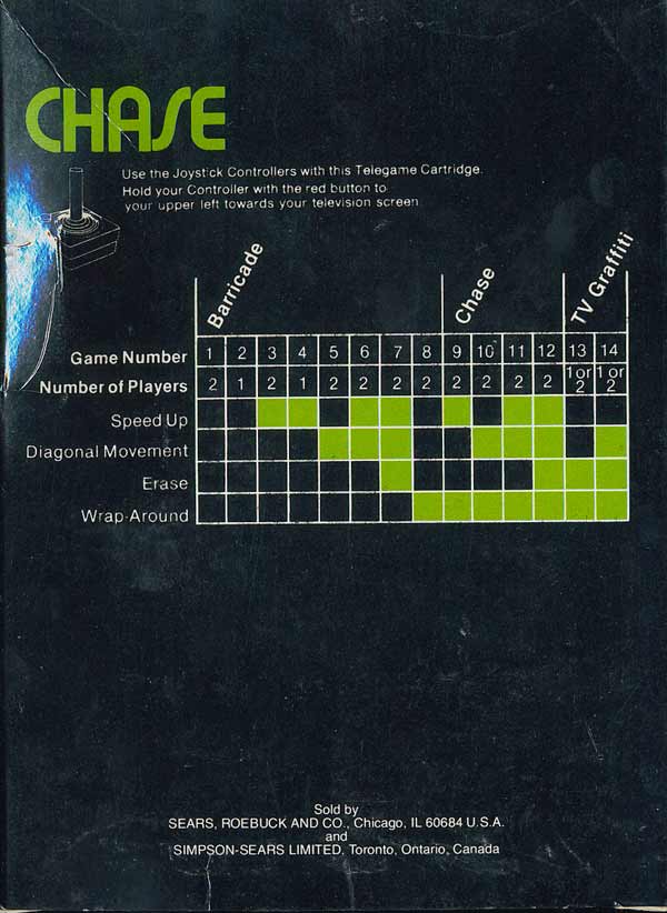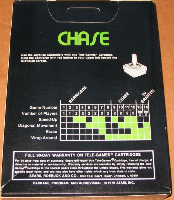 Chase Boxes 1) no ©, black box with green letters, front opening, illustration same as picture label, no warranty info, game options on back, #6-99807 on side, title reads up side of box Front Back