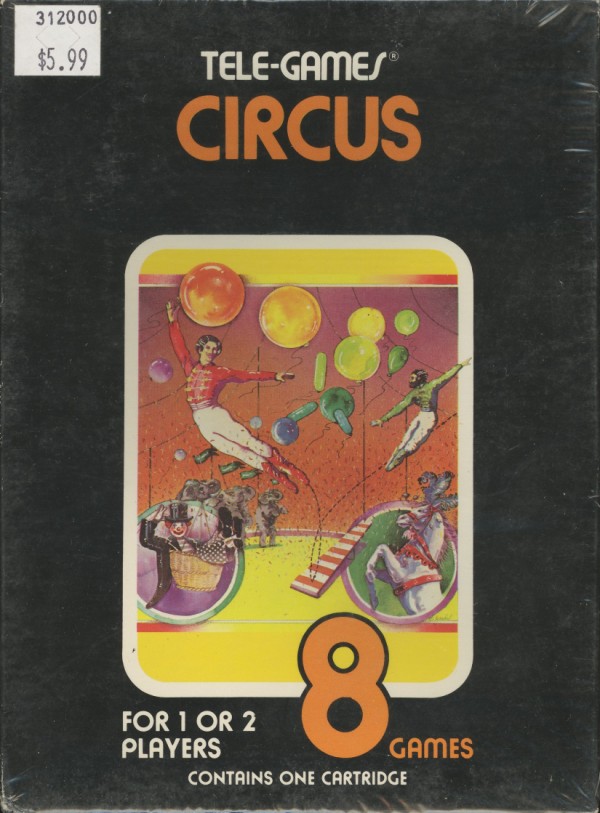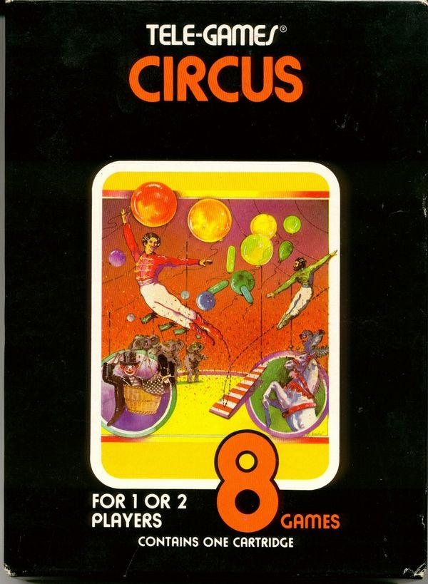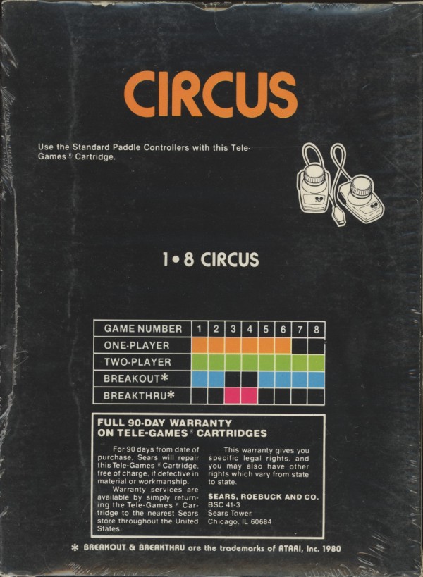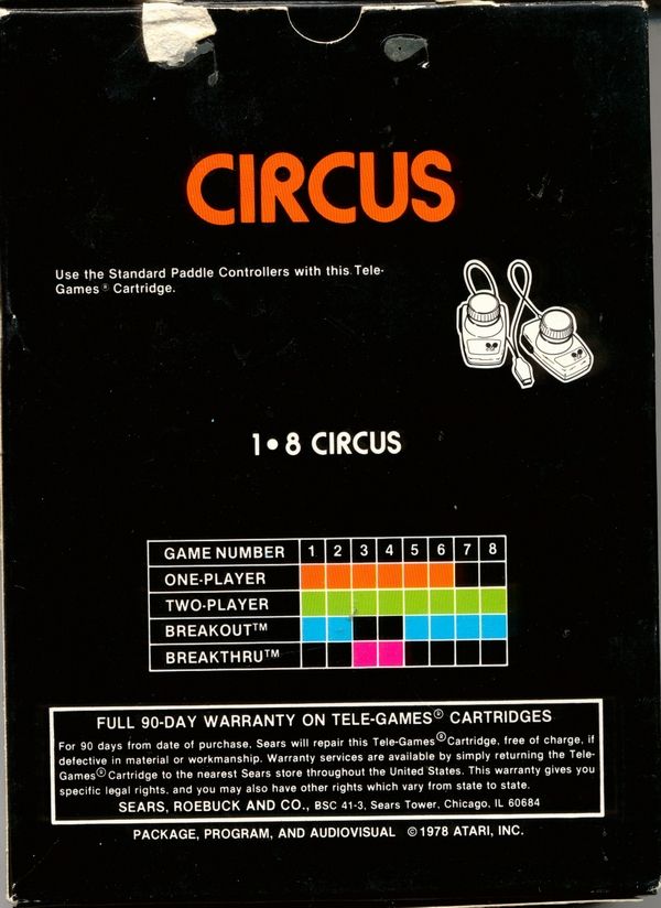 Circus Boxes 1) ©1978, black box with orange letters, warranty info and game options on back, no Printed, #49-75122 on side, glued flap style box, Rev 1 on flap Front Back