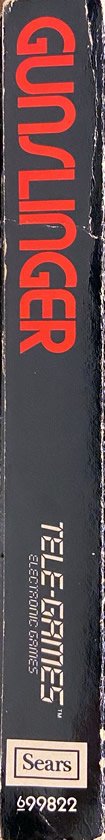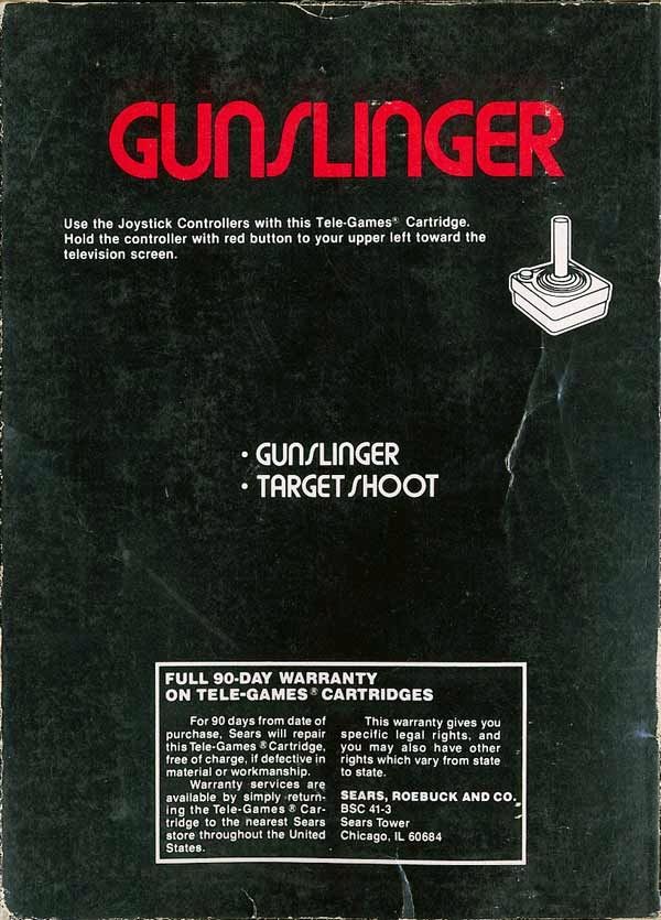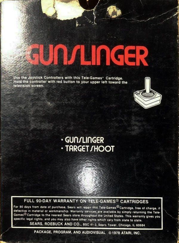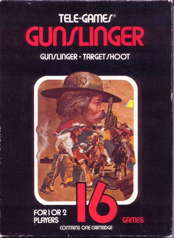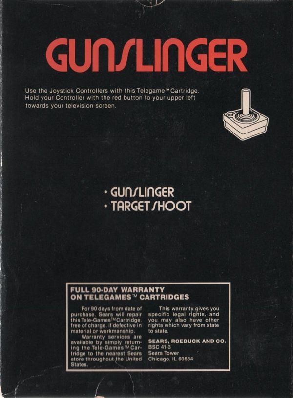 Gunslinger Boxes 1) no ©, black box with red letters, sticker covers bottom portion of picture printed 20 games: “for 1 or 2 players, 16 games, contains one cartridge” #6-99822 on side, ™ next to title on front, standard flap style box, “Adpak San Francisco” on tiny flap Front Back