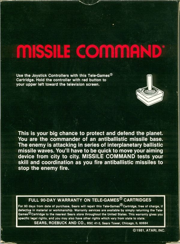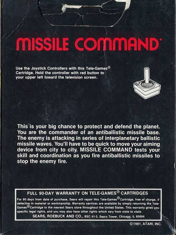 Missile Command Boxes 1) ©1981, black box with red letters, illustration same as picture label, warranty info on back, no game options shown, #49-75166 on side, glued flap style box Front Back