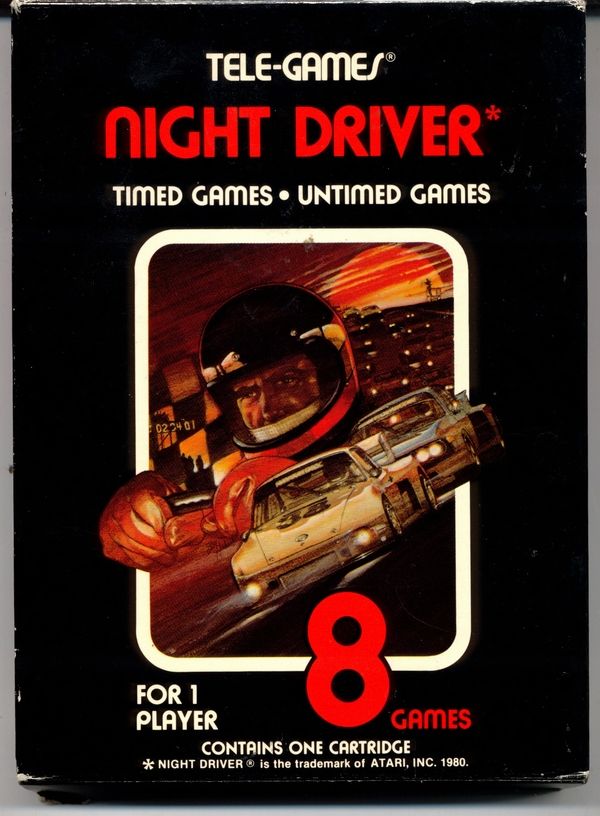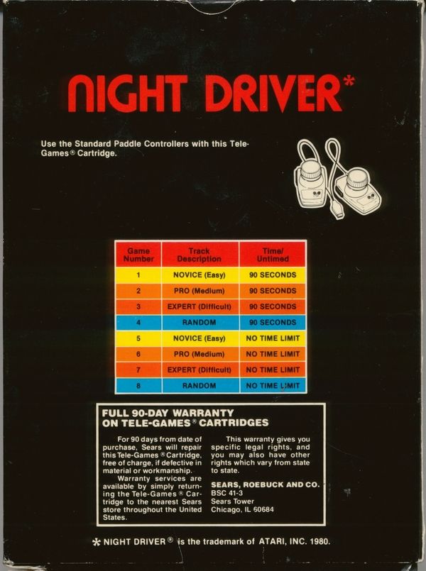 Night Driver Boxes 1) ©1980, black box with red letters, illustration same as picture label, warranty info and game options table on back, no Printed, #49-75119 on side, Rev 1 on flap, standard flap style box “Bertco Graphics” on tiny flap Front Back