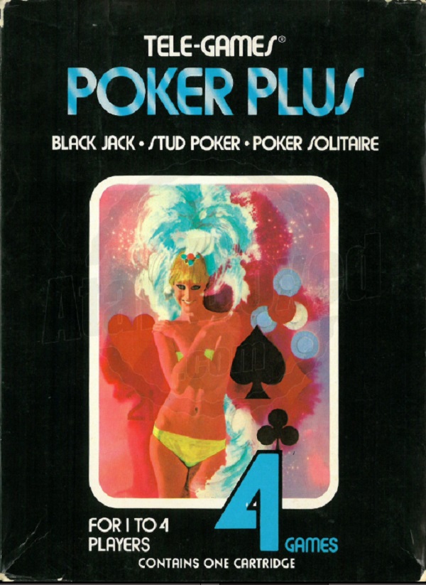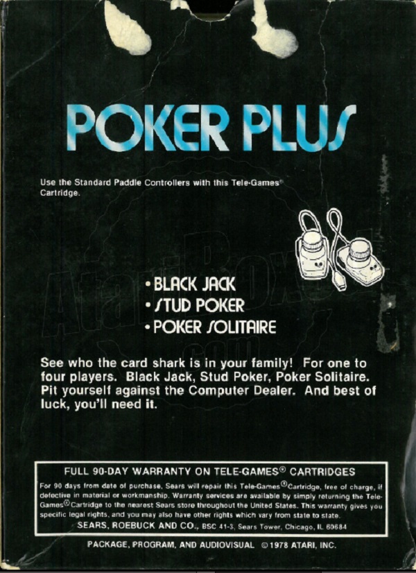 Poker Plus Boxes 1) no ©, black box with blue and white striped letters, illustration same as picture label, warranty info on back, #6-99816 on side, standard flap style box Front Back