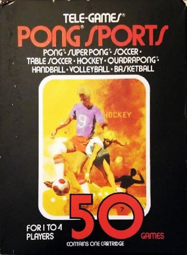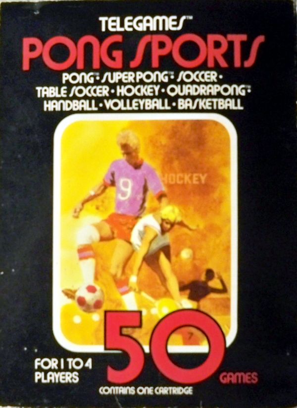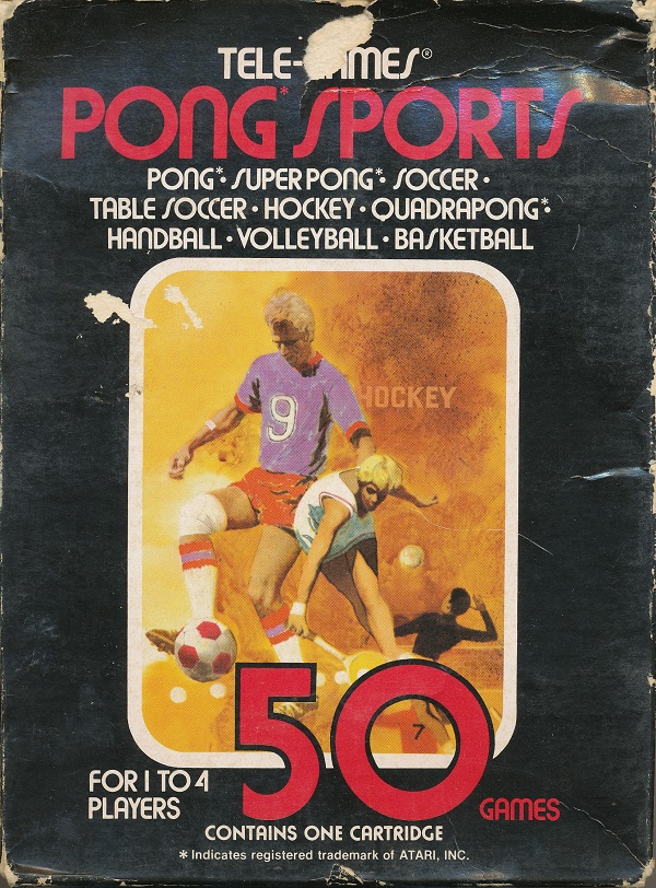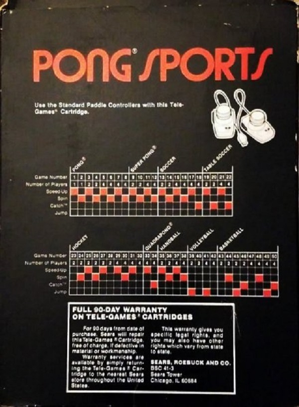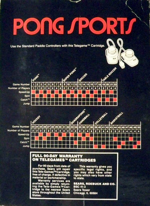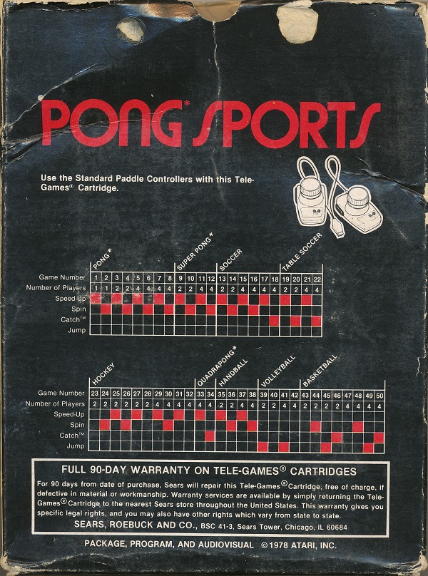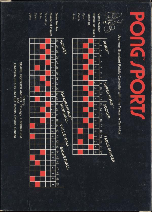 Pong Sports Boxes 1) no ©, black box with red letters, front opening, illustration same as picture label, no warranty info on back, but has game options, #6-99806 on side, title reads up the side of the box Front Back