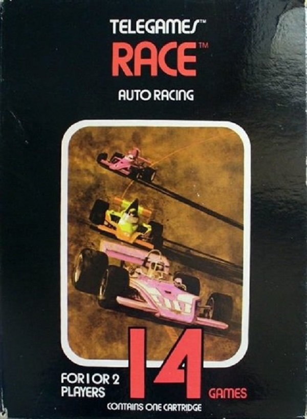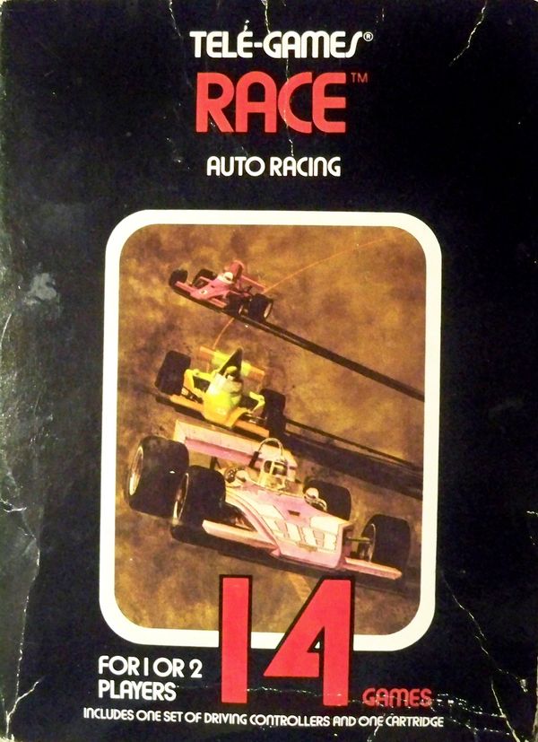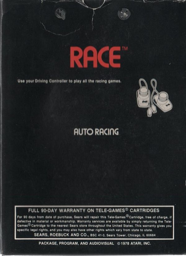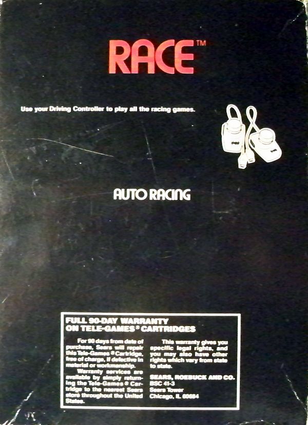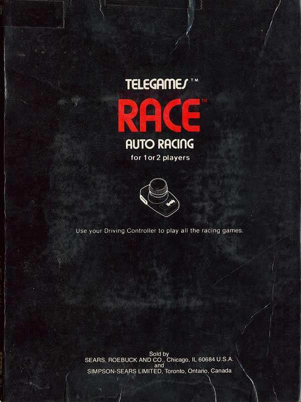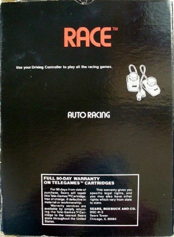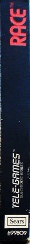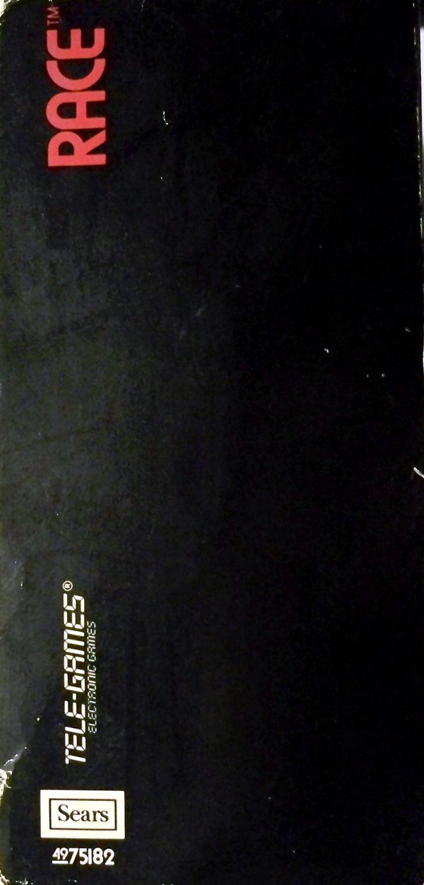 Race Boxes 1) no ©, black box with red letters, front opening, illustration same as picture label, no warranty info or game options on back, #6-99821 on side, title reads up the side of the box Front Back