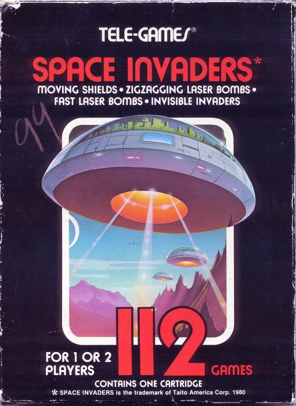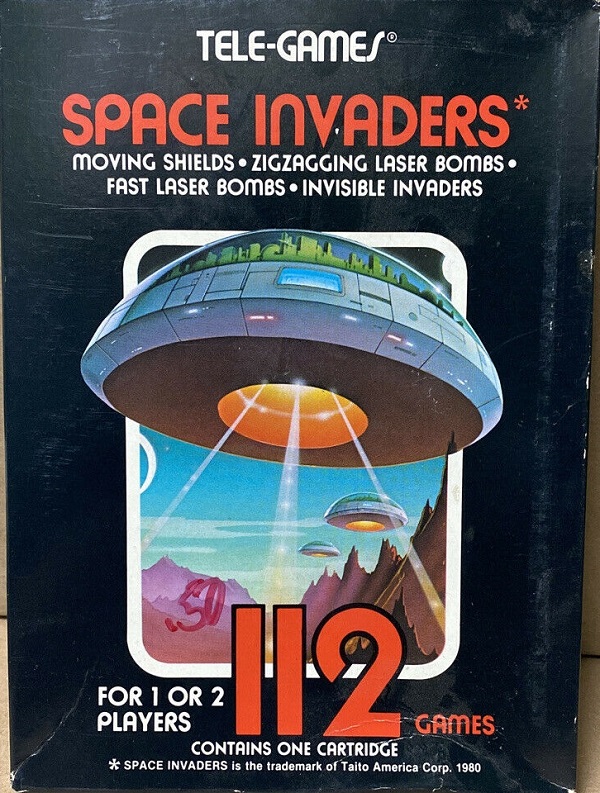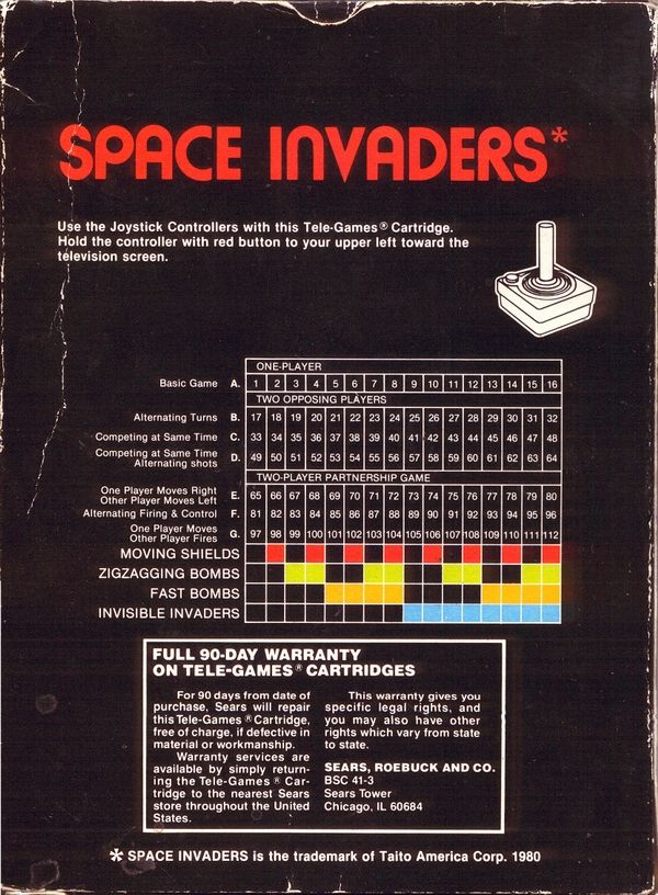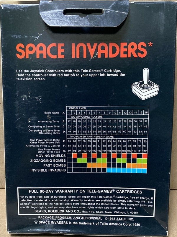 Space Invaders Boxes 1) ©1978, 1980, black box with red letters, illustration same as picture label, warranty info and game options table on back, no Printed, #49-75153 on side, glued flap style box, “Bertco Graphics” on tiny flap Front Back