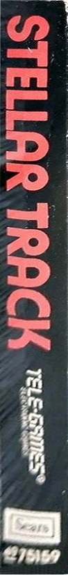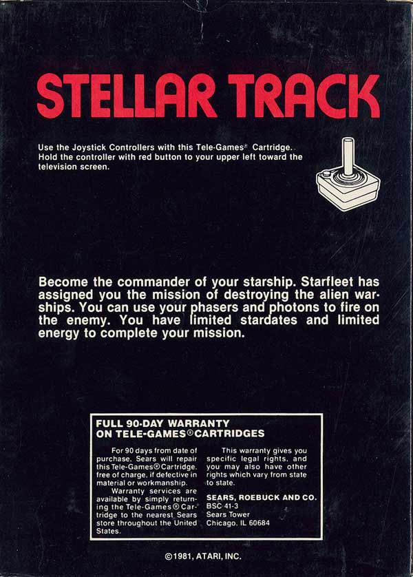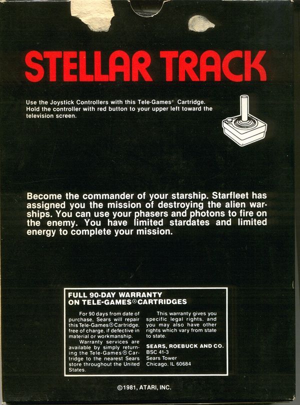 Stellar Track Boxes 1) ©1981, black standard style box with red letters, illustration same as picture label cart, warranty info on back, #49-75159 on side, standard flap style box Front Back