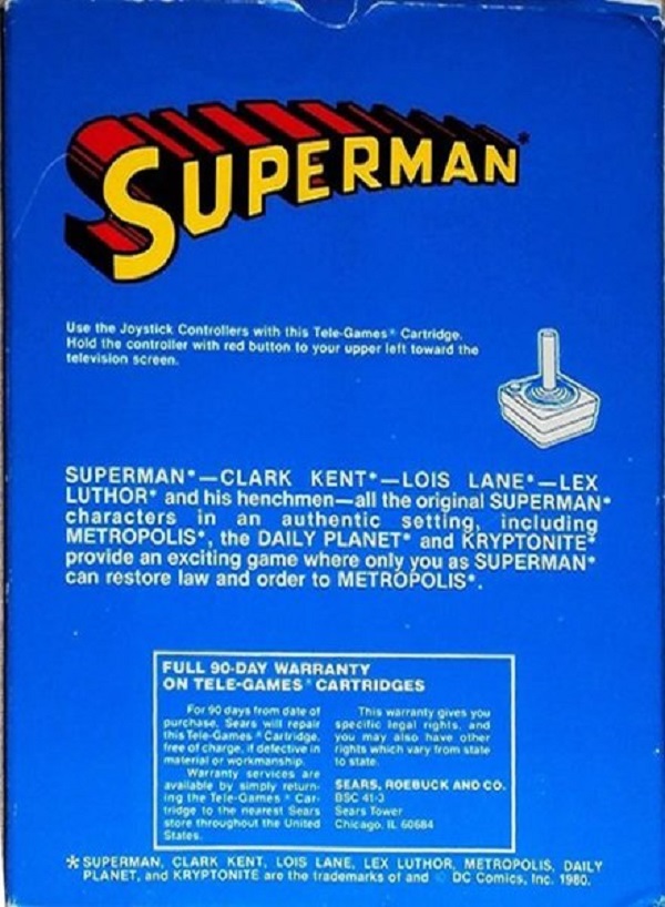 Superman Boxes 1) ©1980, blue box with red and yellow Superman logo, warranty info on back, 2 line copyright notice on back, #49-75152 on side, standard flap style box Front Back