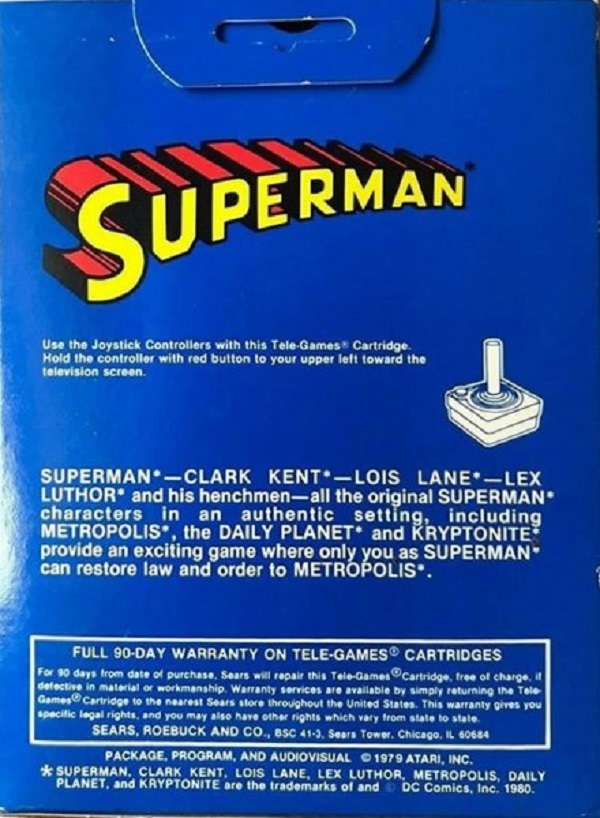2) ©1979, blue box with red and yellow Superman logo, warranty info on back, 3 line copyright notice on back, #49-75152 on side, glued flap style box Front Back