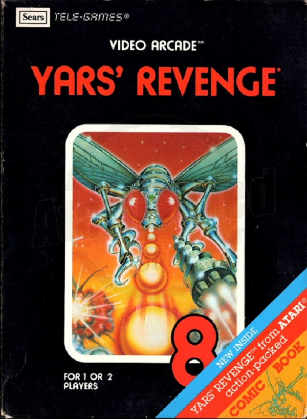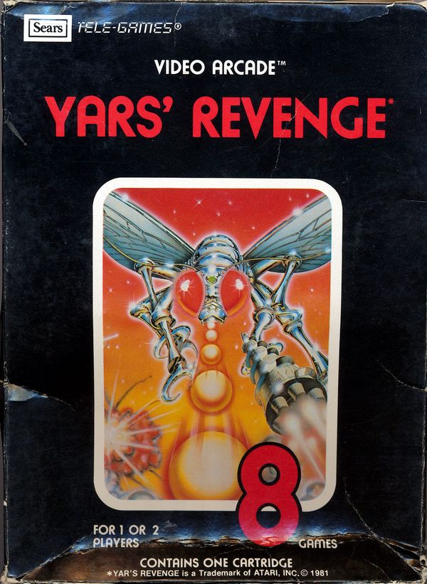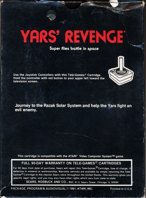 Yars' Revenge Boxes 1) ©1981, black box with red letters, no Comic Book info on front warranty info on back, Printed in USA, #49-75167 on side, Rev 2 on flap, glued flap style box Front Back