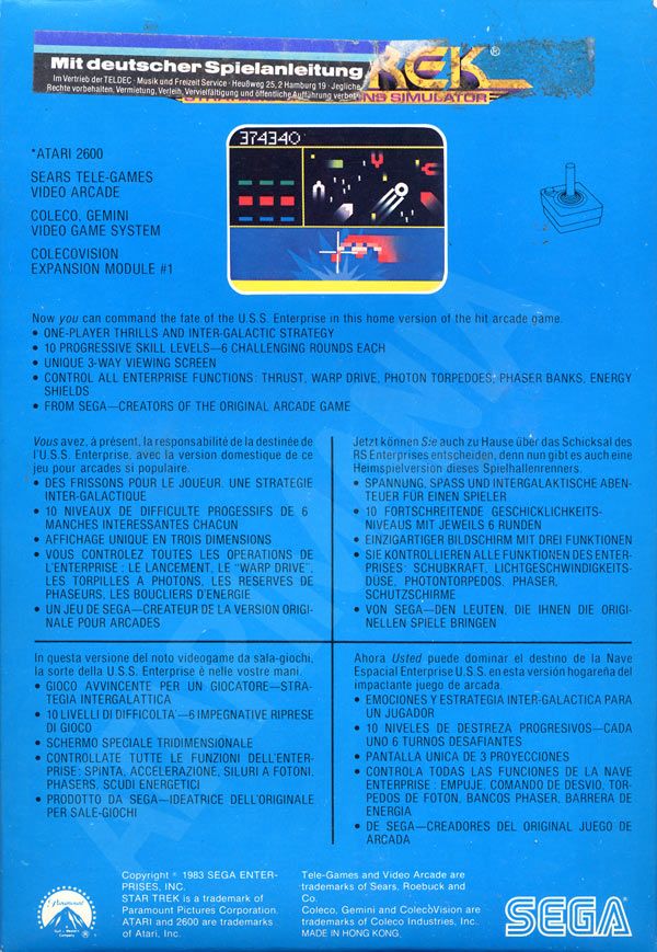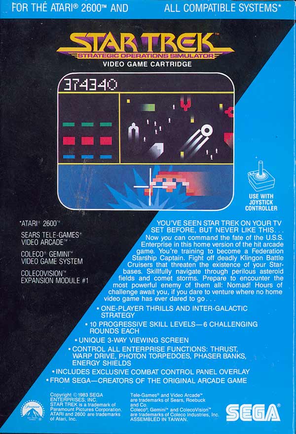 Star Trek Boxes 1) ©1983, blue and black box, illustration same as label, “Includes exclusive combat control panel overlay”, assembled in Taiwan, Paramount logo on back Front Back