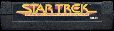 Star Trek Cartridges version a)* C ©1983, black label, four line legal notice, assembled in Taiwan, illustration of Klingons in a ship, EL: “Star Trek SOS” in yellow 3-D letters, CART: “Sega”, grip case